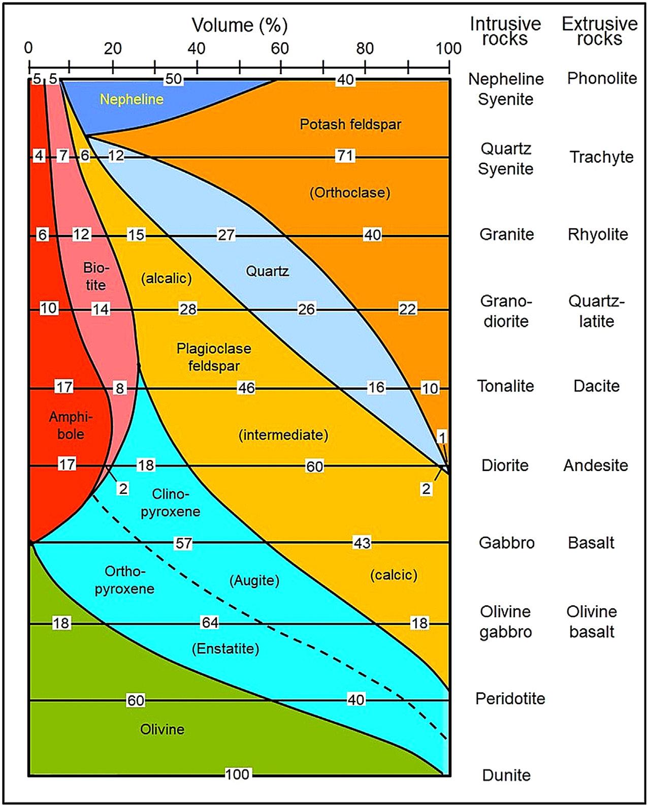Figure 2.1 Mineral composition of intrusive magmatic rocks and their extrusive counterparts. Source: Modified after Clark, 1966; Flemming, 2011.