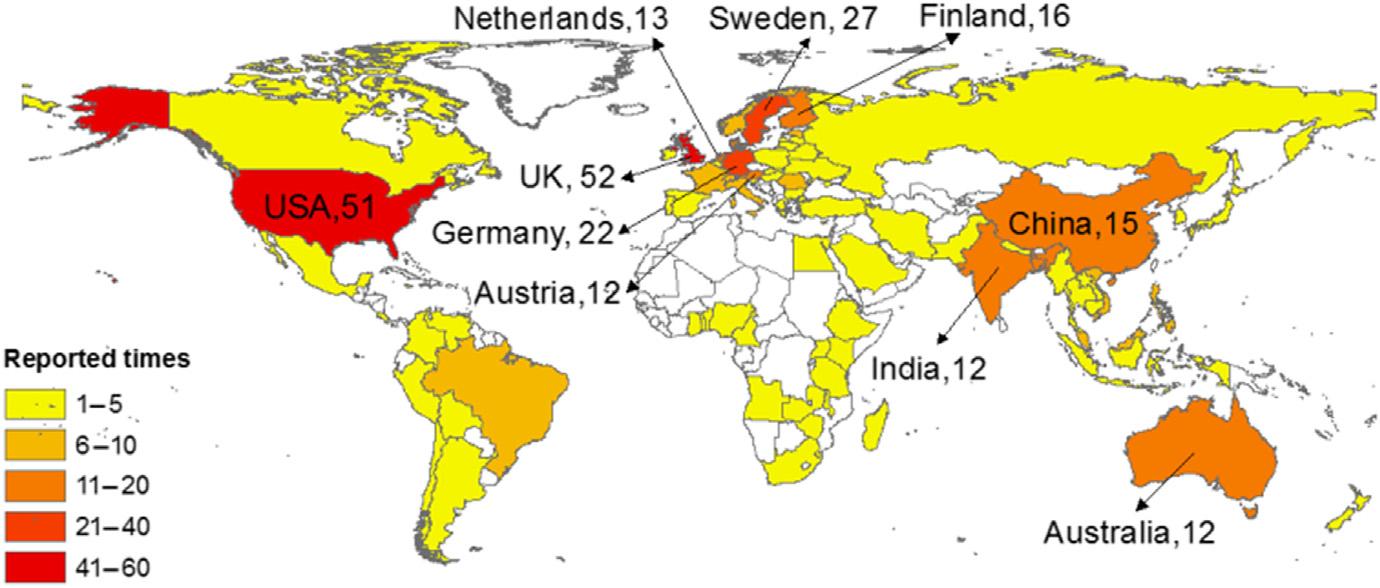 Figure1.4 Geographicaldistributionofcasecountries.Thenumbersarethereportedtimes ofindividualcountries.
