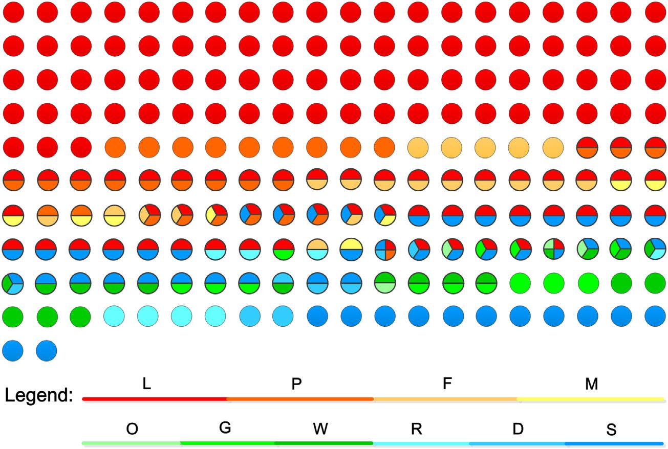 Figure1.6 Anoverviewofthemethodsusedinthereviewed202publications.Eachcircle indicatesonepublication,andthecolorsrepresentdifferentmethodsused.Direct measurementincludes:weighing(W),garbagecollection(G),surveys(S),diaries(D), records(R),andobservation(O).Surveysalsocontainquestionnaires,interviewsand experts’estimation.Indirectmeasurementinvolves:useofliteraturedata(L),useofproxy data(P),foodbalance(F),andmodeling(M).