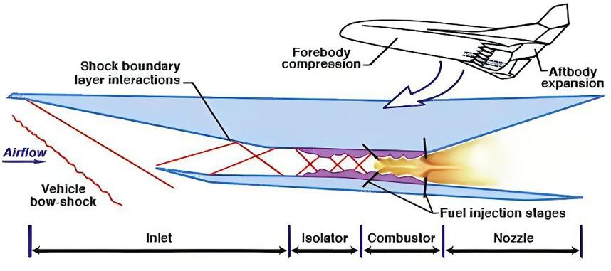 Atypicalconceptualdiagramofascramjetisshownin Fig.1.5[10,13].A scramjetpropulsionsystemisanintegrationofascramjetengineandapropulsionvehicle.Thescramjetenginerequiresthesupportofthepropulsion vehicletomeettheminimumrequirementofmaintainingspeedwithan equivalentvalueofMachnumber3,foritscontinuousworkingandattendinghypersonicspeed.So,thescramjetengineisequippedwithfourkey components,namely,aninternalinlet,anisolator,acombustor,andan internalnozzle,whereasthefore-bodyandaft-bodyrepresentthepropulsionvehiclecomponents.Ascramjetengineismountedinsuchawaythat itacquirestheentirelowersurfaceofthevehiclebody.Thevehicleforebodyistheheartoftheairinductionsystem,whereasthevehicleaft-body isthebackboneofthenozzlecomponent.