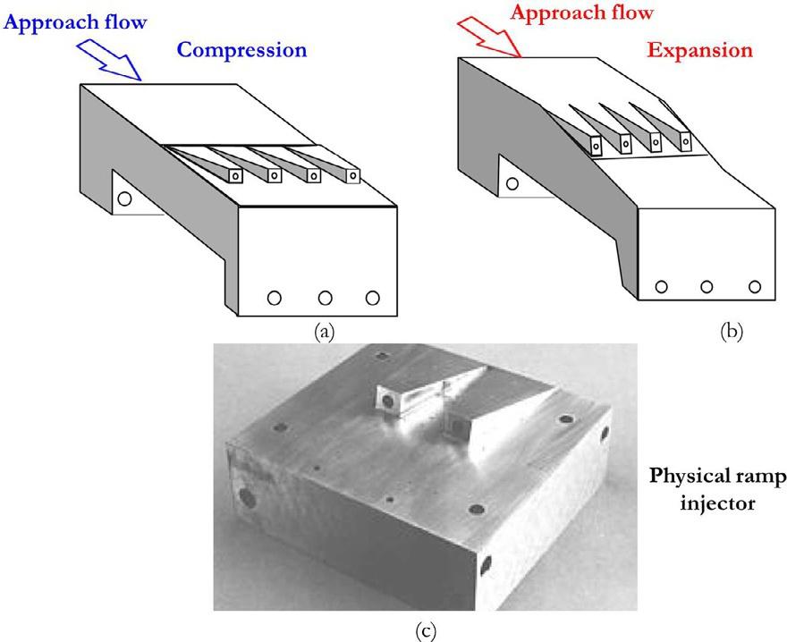 ThecredittothisapproachgoestoBurtonetal. [50] whoproposedawallmountedrampwithanintegratedsetofnozzlesforalmostaxialfuelinjection [51].Itwaspossibletostudytheeffectoframpinclinationwithrespect totheaxis,whichresultedinthedevelopmentofthefollowingtwoconfigurations,namely,asweptcompressionrampandasweptexpansionramp,as shownin Fig.1.8.Thestudyofasweptcompressionrampdemonstrated improvedair–fuelmixingduetothepassagebetweentherampandwallactingasadiffuser,which,inturn,increasesthedensityofthemixture,and, also,recirculationzonesaresetupowingtotheflowseparationfrom thewall.