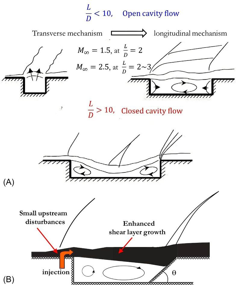 Fig.1.7 (A)Schematicdiagramofdifferentflowfieldsoveracavityfordifferentlengthto-depthratios, L/D [31].(B)Smalldisturbancescreatedbyafueljetincavity-based injection [47].