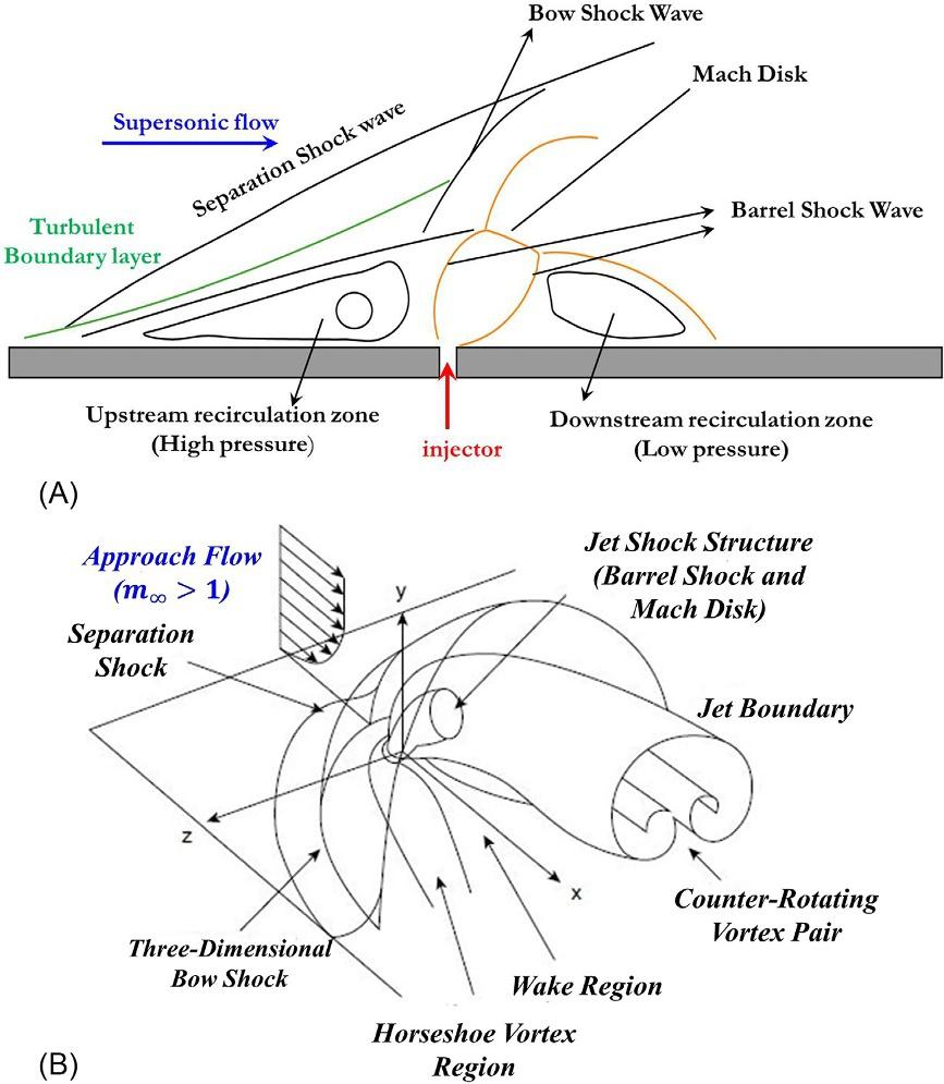 Fig.1.6 (A)Schematicdiagramof2Dand(B)3Dflowfieldsinatransverseinjectionbasedsupersoniccombustor [21–23].