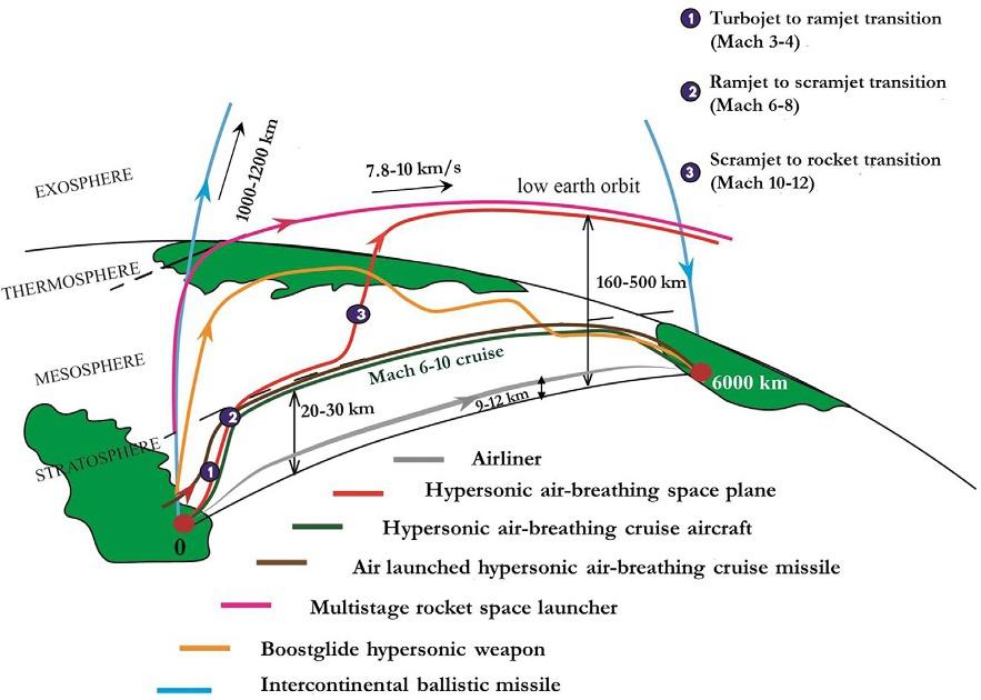 Hypersonicair-breathingspacecrafthavetheabilitytocarrypayloadstoa lowEarthorbitatahighrate.However,duetooxidizershortage,escaping theatmosphereisnoteasy,sothepayloadmustshifttoasecond,rocketbasedstageatMach10–12toachievehypervelocitiesintheorderofMach 20–25. Fig.1.4 illustratestheschematicdiagramofflighttrajectoriesfordifferentaerospacesystemsincludinghypersonicscramjet-poweredairbreathingvehicles [3]