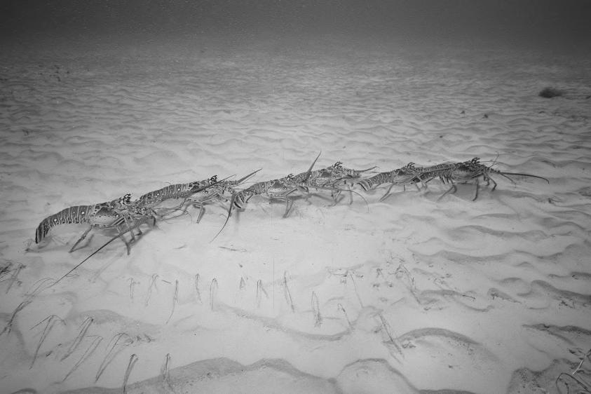 Figure 1. A line of Caribbean spiny lobsters migrating across the Atlantic Ocean foor during their autumn movements into deeper waters.
