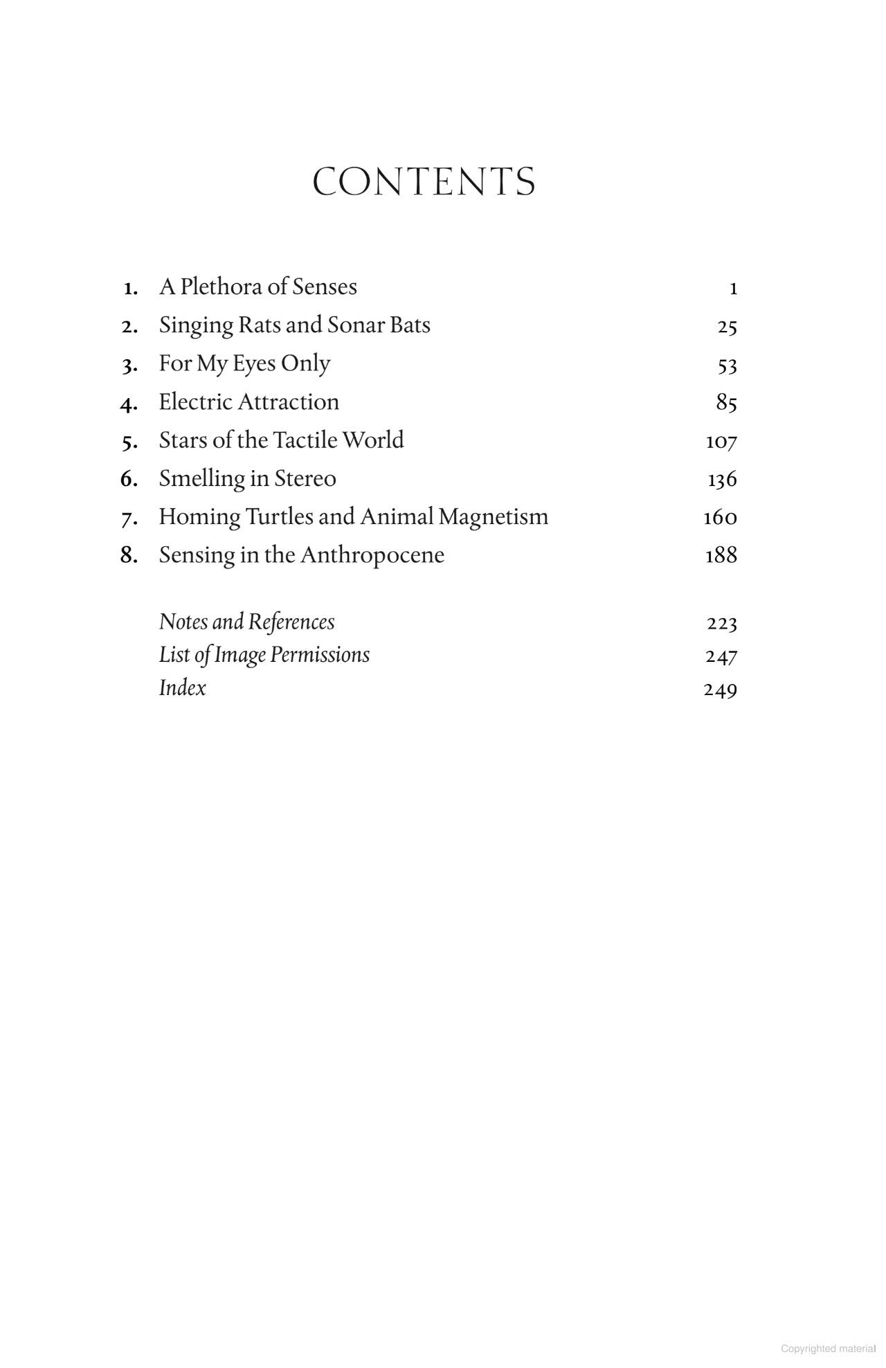 comes from a wide range of similar species, as is the case with groups of fsh that all produce and detect low levels of electricity. But the idea is the same: each animal or group reveals the wonderful nature of animal senses, how they operate, what they are used for, and their importance to an animal in the environment in which it lives.