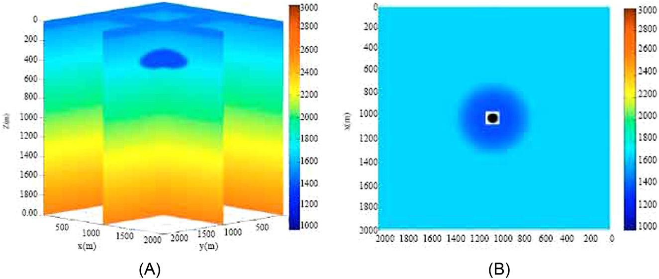 Figure1.2 (A)VelocitymodelusedintheUTPstudy.Thelowvelocityatabout 400mrepresentsashallowgasanomaly.(B)Velocitydepthsliceat300m.Theblack circleisthetargetlocation.