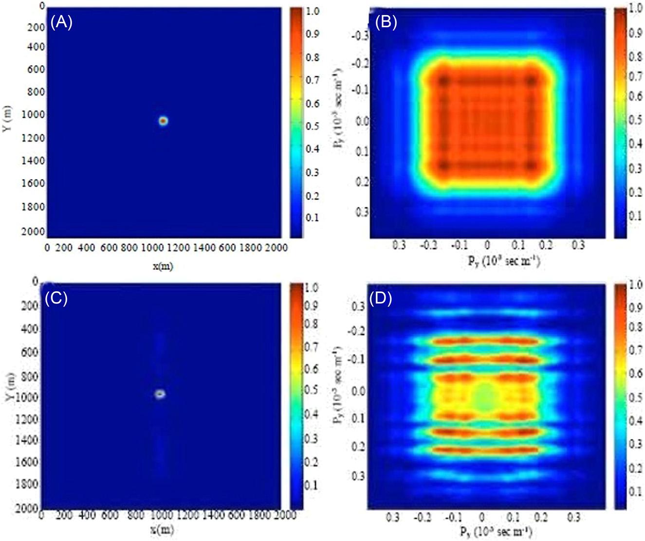 Figure1.4 (A).Full3Dresolutionfunctionversus (C)aconventional3Dresolutionfunction.Theresolutionfunctionisalmostperfectatthetargetlocationandzeroelsewhere. Ontheotherhand,theresolutionfunctionfortheconventional3Dhassidelobesenergy alongtheydirection.(B)and(D)arefull3Damplitudeversusrayparameter(AVP)versus conventional3DAVP.TheconventionalAVPfunctionhasverystrongacquisitionfootprint.