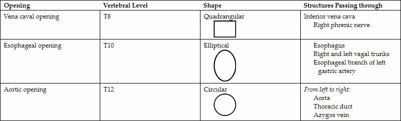 There are 3 major (large) openings in the diaphragm. The details of these openings and structures passing through them are given in Table 1.1.