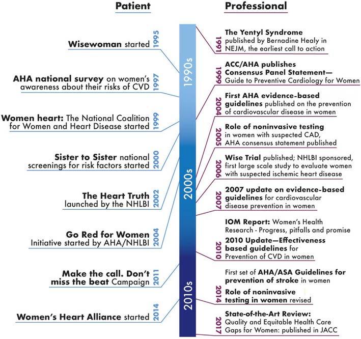 FIGURE 3 Professional and Patient‑Lead Advances Regarding Cardiovascular Disease in Women. ACC, American College of Cardiology; AHA, American Heart Association; ASA, American Stroke Association; CAD, coronary artery disease; CVD, cardiovascular disease; IOM, Institute of Medicine; JACC, Journal of the American College of Cardiology; NEJM, New England Journal of Medicine; NHLBI, National Heart, Lung, and Blood Institute; WISE, Women’s Ischemic Syndrome Evaluation. Reproduced with permission from [13]
