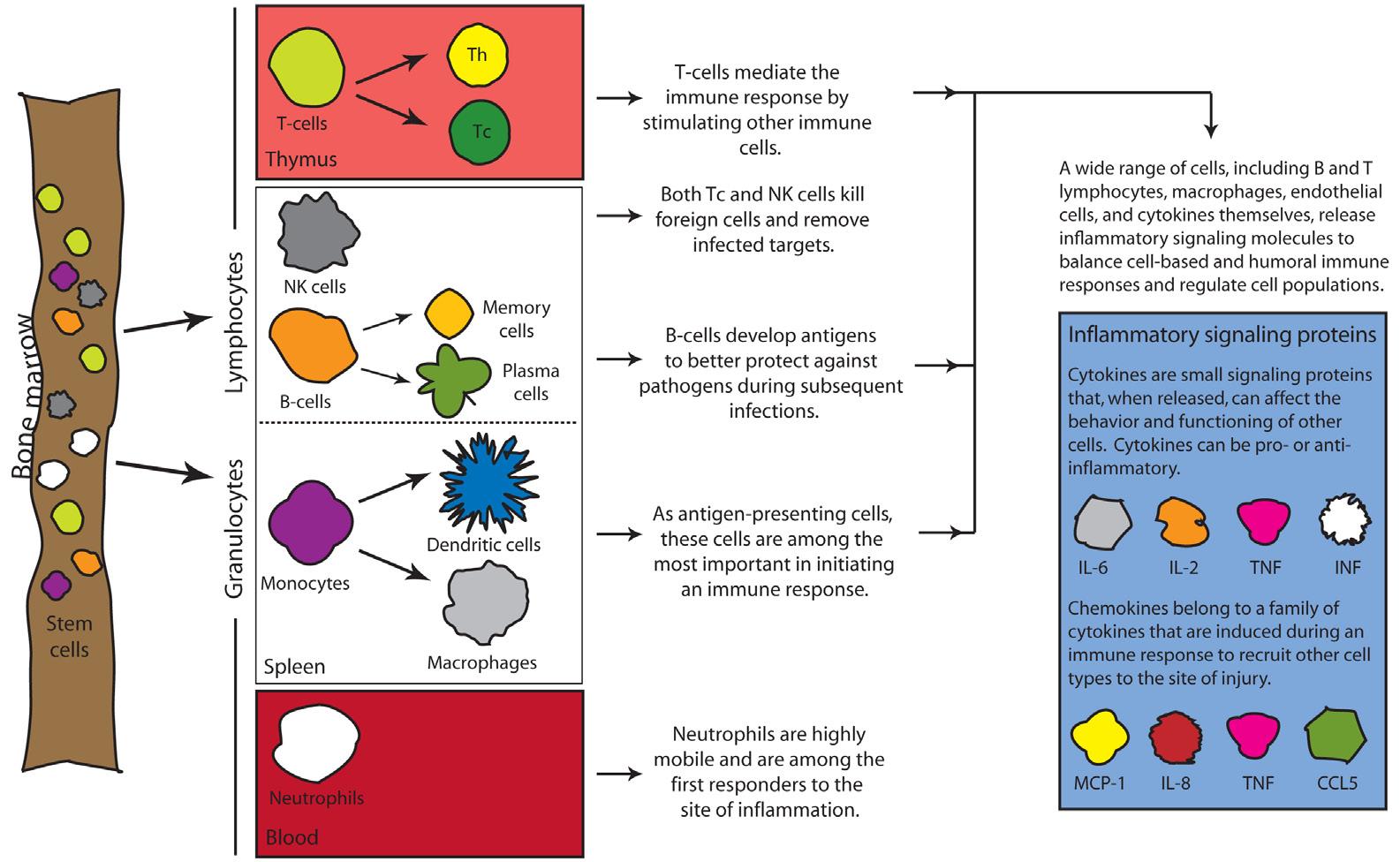 A vast array of inflammatory cells mediates peripheral and central immune responses. The immune response is divided into two component systems, the innate and adaptive systems, which differ in their ability to recognize and remember specific pathogens and antigens. While the innate system mounts a generalized and nonspecific response, the adaptive system triggers a response that is both pathogen/antigen specific and based on an immunological memory of previous responses. Despite this major difference, both
