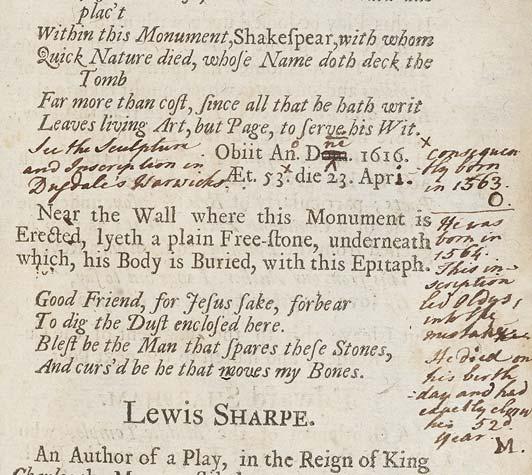 Fig.1.3 EdmondMalone’smanuscriptcorrectionofWilliam Oldys’snoteonShakespeare’sbirthdate,inMalone’sinterleaved copyofGerardLangbaine, AnAccountoftheEnglishDramatick Poets (1691).©BodleianLibraries,UniversityofOxford.