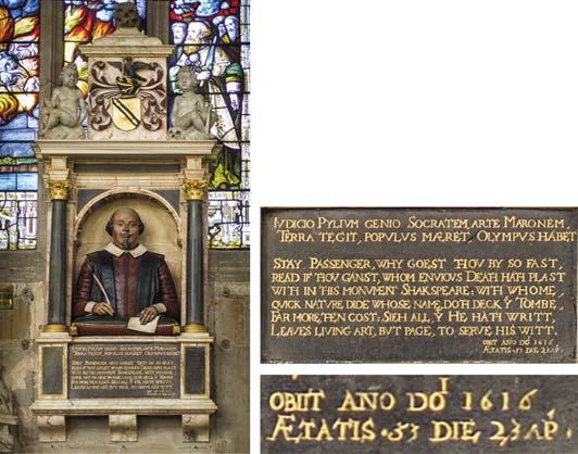 WhilenodatesappearonShakespeare’sgravestoneinHolyTrinity ChurchinStratford,thereisoneonthebronzeplaqueatthebaseofthe funerarymonumentaboveit(Fig. 1.1).