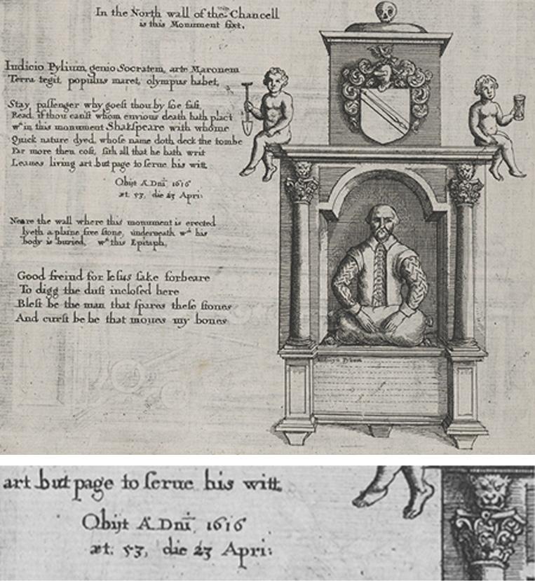 Fig.1.2 EngravingofShakespeare’sfunerary monumentbyWenceslausHollar,inWilliam Dugdale, TheAntiquitiesofWarwickshire Illustrated (1656),withdetailofobit.