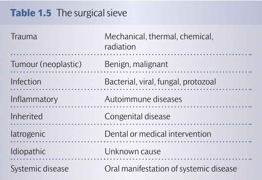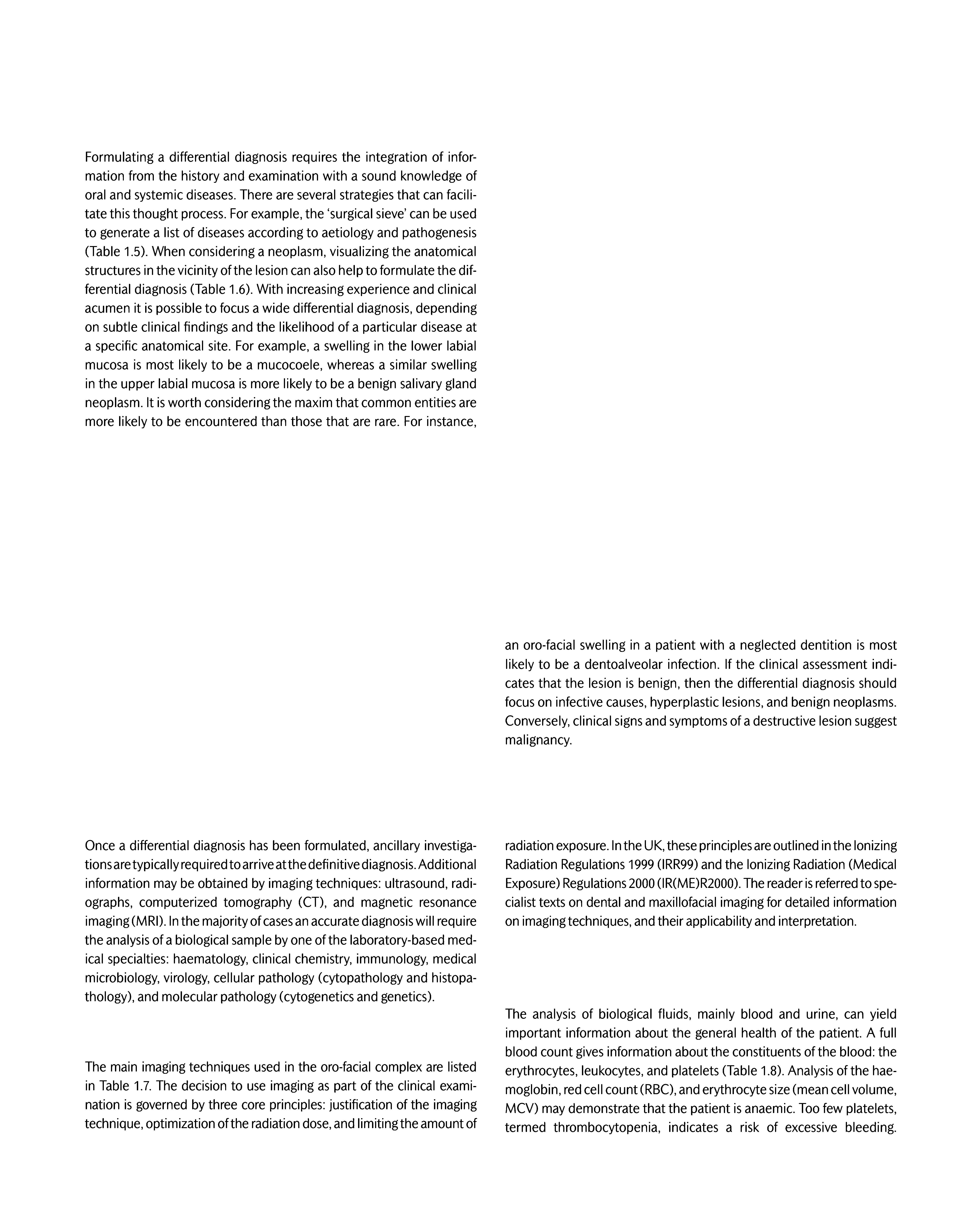 Formulating a differential diagnosis requires the integration of information fromthe history andexamination witha sound knowledge of oral andsystemic diseases Thereareseveral strategiesthatcan facilitatethisthoughtprocess Forexample,the‘surgicalsieve’canbeused to generate a list of diseasesaccordingtoaetiology andpathogenesis (Table1.5) Whenconsideringa neoplasm,visualizingtheanatomical structuresinthevicinityofthelesioncanalsohelptoformulatethedifferential diagnosis(Table1.6) Withincreasingexperienceandclinical acumen it ispossibletofocusa wide differentialdiagnosis,depending on subtleclinical findings andthe likelihoodofa particular disease at a specific anatomical site For example, a swelling in the lower labial mucosa is most likely to be a mucocoele, whereas a similar swelling intheupper labialmucosa ismore likelytobea benignsalivary gland neoplasm Itisworthconsideringthemaximthatcommonentitiesare more likely to be encountered than those that are rare For instance,