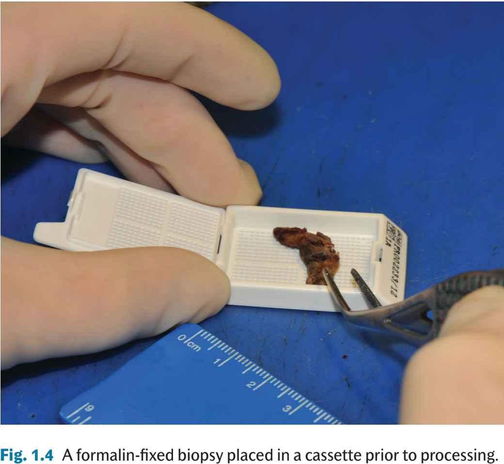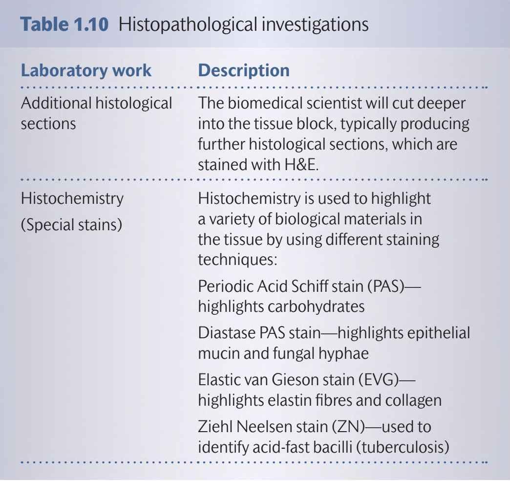 Whenthespecimenarrivesinthelaboratory,itischeckedtoensure thatitiscorrectlylabelledandtheaccompanyingrequestformiscompletedsatisfactorily.Thespecimenisthenassignedauniquespecimen number and starts its journey throughthe laboratory The specimen is retrieved from the container and described; this constitutes the macroscopic description The pathologist may then slice the biopsy toensureoptimal samplingandplacesthetissueintocassettesready fortissueprocessingandembedding(Fig 1.4) Theresultantformalinfixed paraffin-embeddedtissue block isthen ready for sectioningon a rotary microtome (Fig 1.5) Very thin(5pm) sections are mounted on glass slides and stained with haematoxylin and eosin (H&E) (Fig 1.6) Haematoxylinstainscellnucleidarkblueandconnectivetissueglycoproteinslightblue;bycontrasteosinstainsthecytoplasmand connectivetissue collagenfibresareddish pink colour The slidesare then examinedbythe pathologist;insome instancesa diagnosis can berenderedbyexaminingtheH&Estained sectionsalone However, additional stains or immunohistochemistry may be required before a definitive diagnosis can be formulated (Table 1.10). The pathologistwilldescribethesalientmicroscopicfeaturesandprovideeithera definitivediagnosisor adifferentialdiagnosisincasesthatrequirefurther clinico-pathological correlation. A typical histopathology report