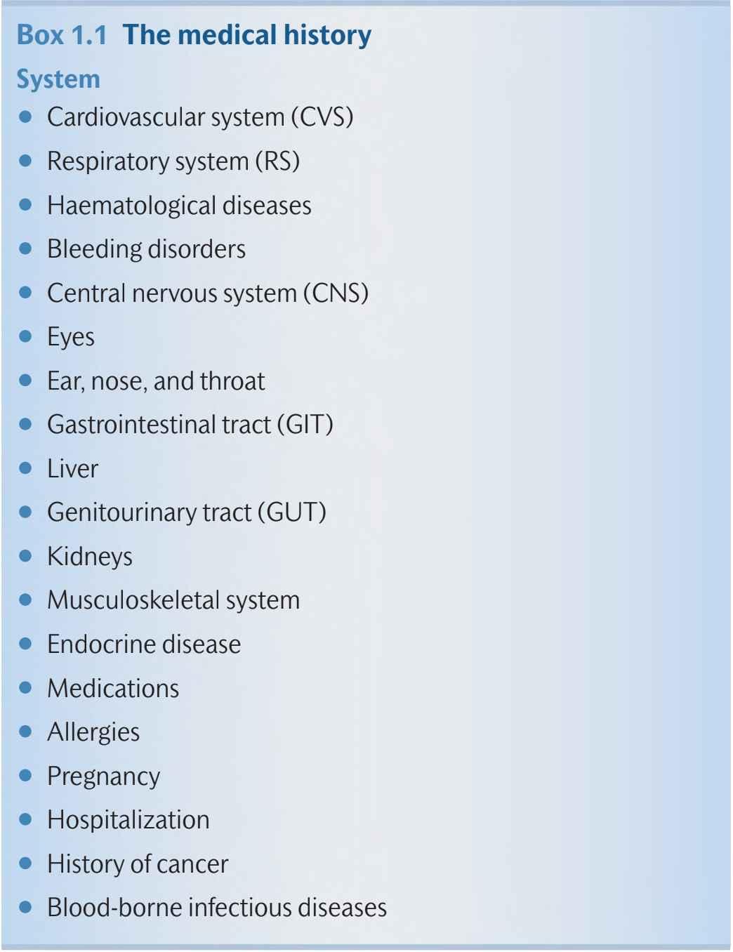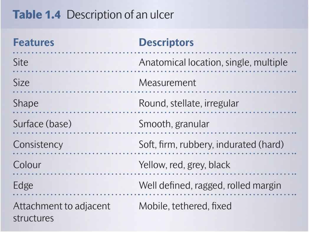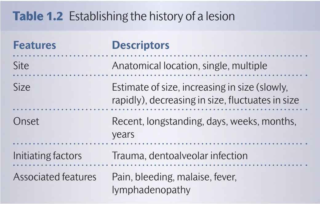 The most common presenting problems relate to pain or the development of a lesion: swelling, lump, ulcer, or white/red patch. To establish a comprehensive pain history, the features listed in Table 1.1 should be addressed Obtaining an accurate history for a lesion is dependent on the patient noticing the abnormality in the first instance and, as a consequence,the information may be rather vague; however, it is important to ascertain the key points listed in Table1.2