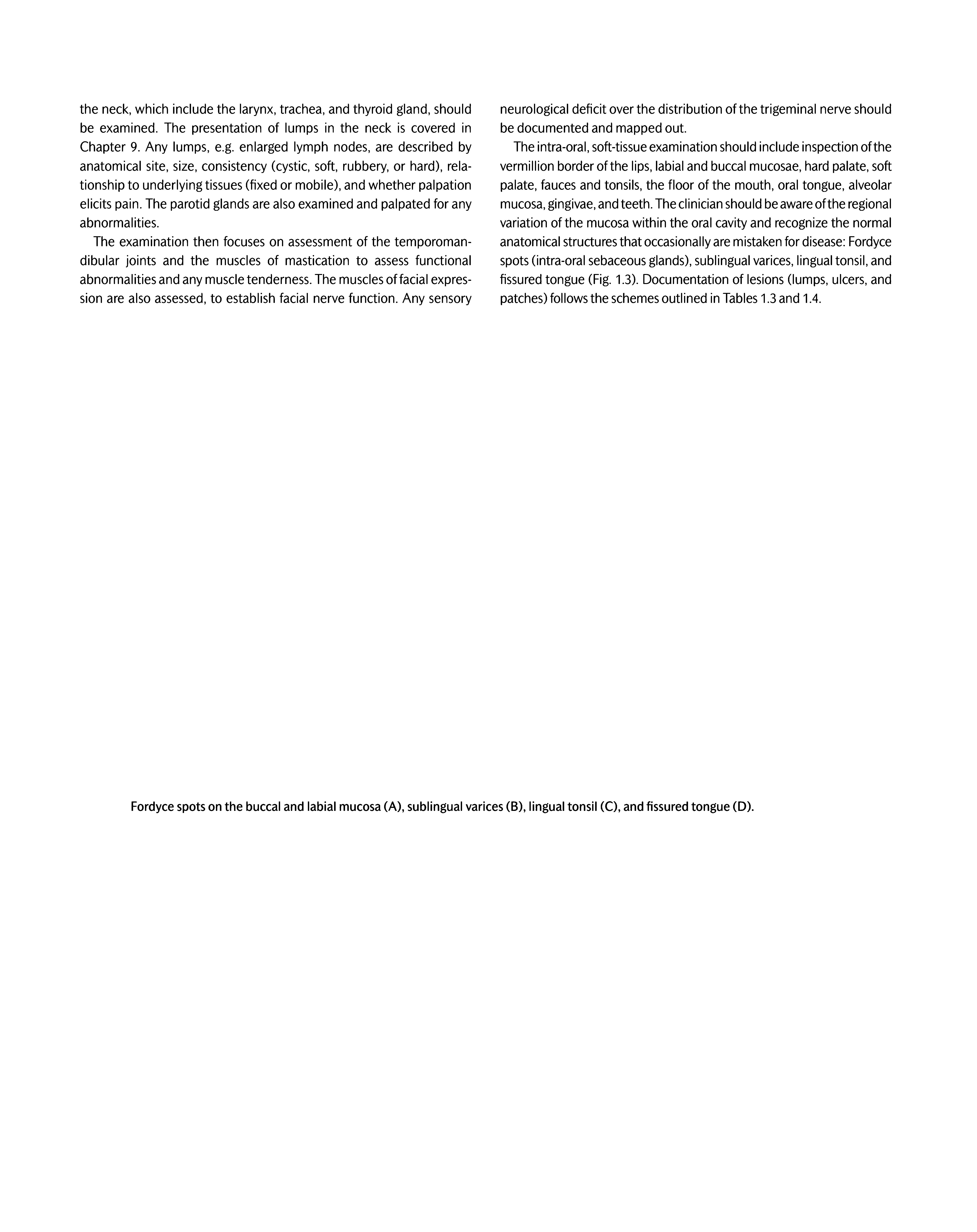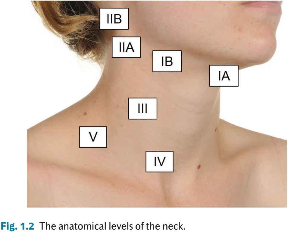 Routineexaminationoftheoro-facialcomplexshouldincludeinspection and palpation ofthe neck The sequence shouldcommence with the submandibular triangle, which contains the submandibular gland and level Ilymphnodes(level IA submental lymph nodes and levelIB submandibular lymphnodes) Thisisfollowedby levelIIlymphnodes, superior part of the deep cervical chain, includingthe jugulodigastric lymph node and level II lymph nodes (levels IIA and MB lymph nodes located anterior and posterior to the accessory nerve, respectively), levelIIIlymph nodes(middle part of the deep cervical chain),level IV lymphnodes(theinferiorpartofthedeepcervicalchain,whichincludes thejugulo-omohyoidlymphnode),andlevelVlymphnodesintheposterior triangle of the neck (Fig 1.2) Finally,the mid-line