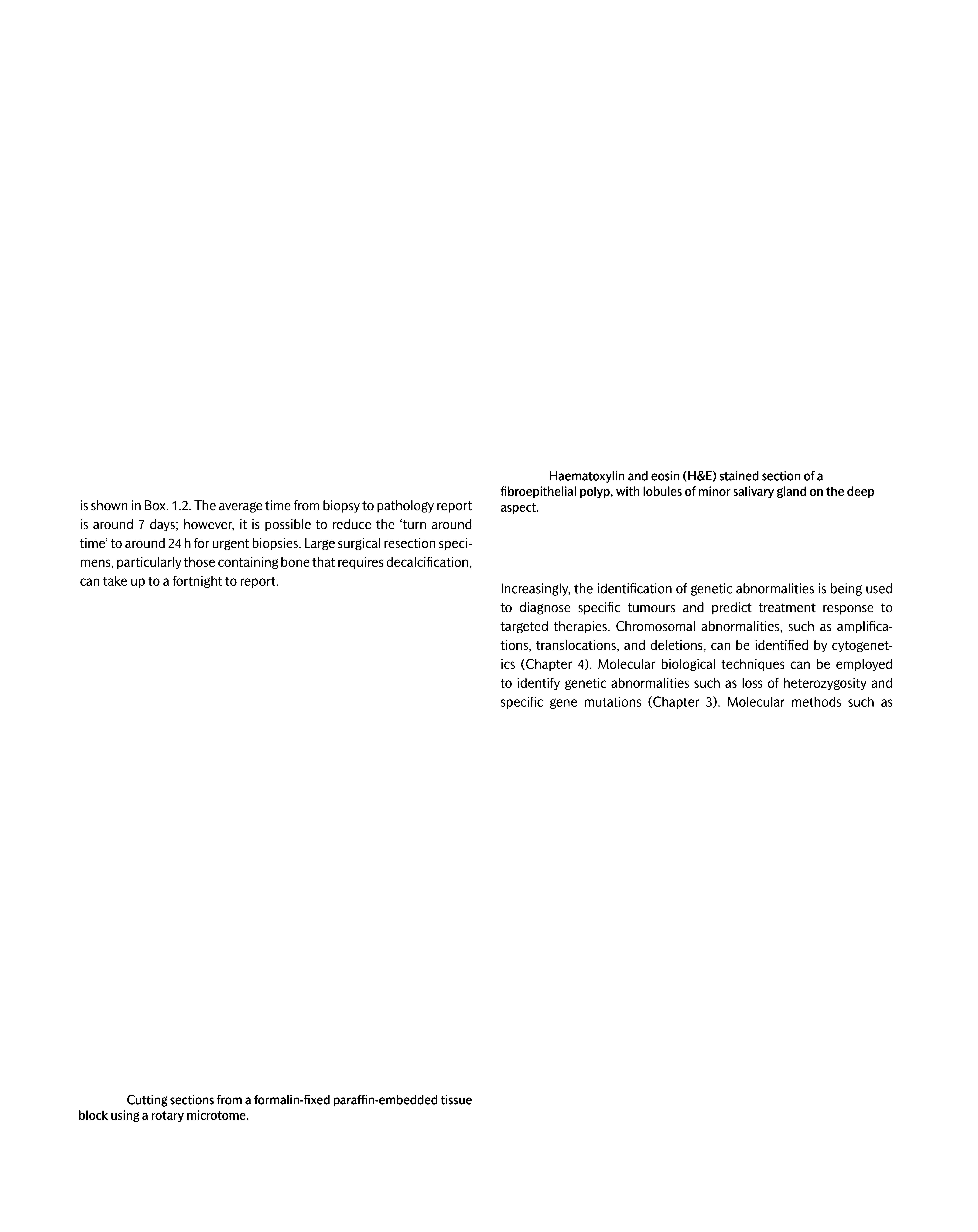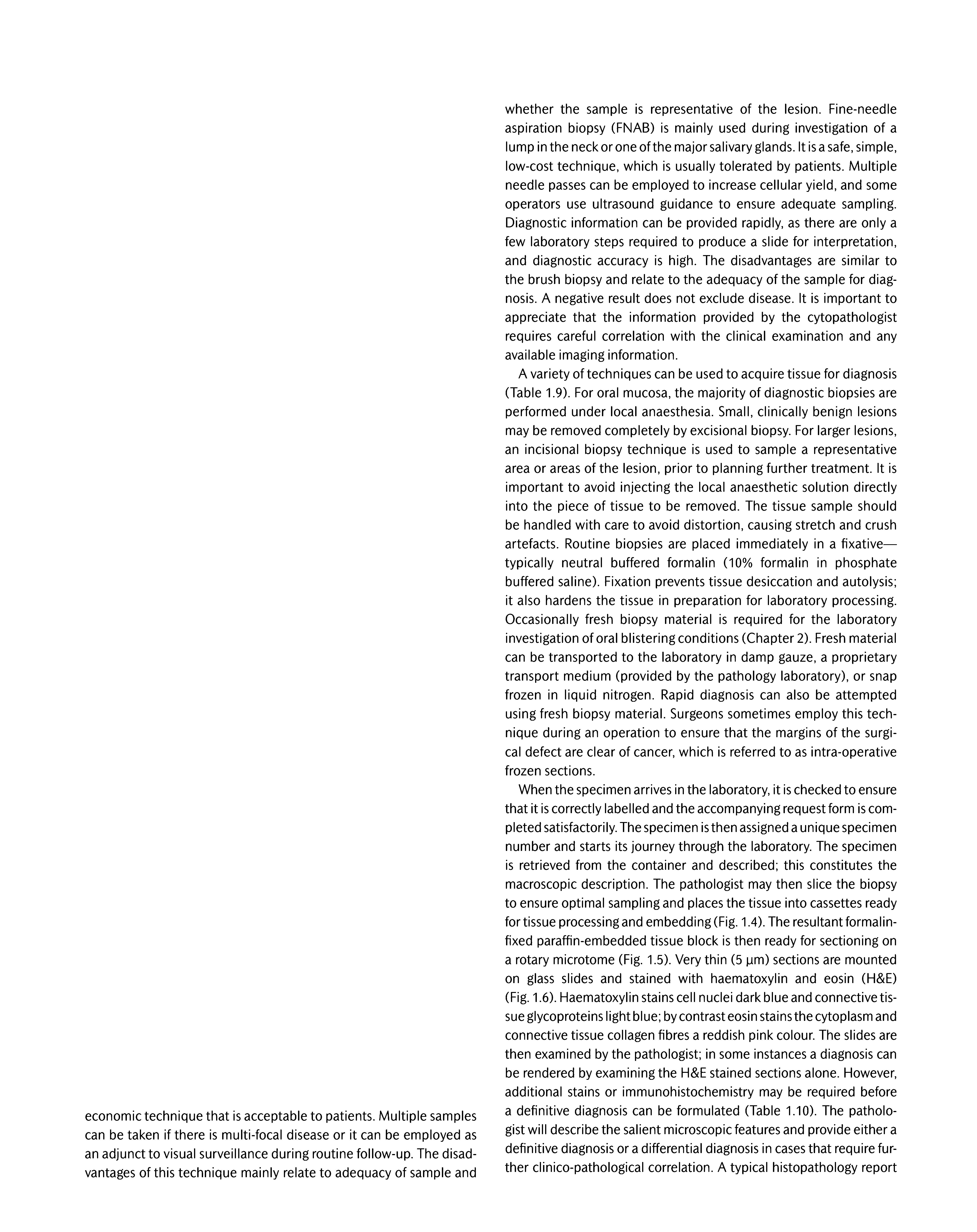 A varietyoftechniquescanbeusedtoacquiretissue for diagnosis (Table1.9) For oral mucosa,the majority of diagnostic biopsies are performed under local anaesthesia Small, clinically benign lesions mayberemovedcompletely byexcisional biopsy For larger lesions, an incisional biopsy technique is used to sample a representative area or areas ofthe lesion,prior to planningfurther treatment It is important to avoid injecting the local anaesthetic solution directly into the piece of tissue to be removed The tissue sample should be handled withcare to avoid distortion,causingstretch and crush artefacts Routine biopsies are placed immediately in a fixative typically neutral buffered formalin (10% formalin in phosphate buffered saline) Fixation prevents tissue desiccation and autolysis; it also hardens the tissue in preparation for laboratory processing Occasionally fresh biopsy material is required for the laboratory investigationoforalblisteringconditions(Chapter2) Freshmaterial can be transported to the laboratory in damp gauze, a proprietary transport medium (provided by the pathology laboratory), or snap frozen in liquid nitrogen Rapid diagnosis can also be attempted usingfresh biopsy material Surgeons sometimes employ this technique during an operation to ensure that the margins of the surgical defect are clear ofcancer, which is referredtoas intra-operative frozensections.