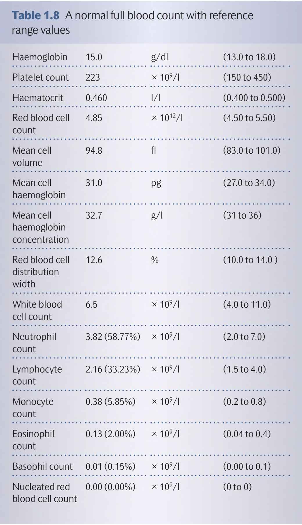 The analysis of biological fluids, mainly blood and urine, can yield important information about the general health of the patient A full bloodcountgivesinformationabouttheconstituentsoftheblood:the erythrocytes,leukocytes,andplatelets(Table1.8) Analysisofthehaemoglobin,redcellcount(RBC),anderythrocytesize(meancellvolume, MCV)maydemonstratethatthepatient isanaemic.Toofew platelets, termed thrombocytopenia, indicates a risk of excessive bleeding