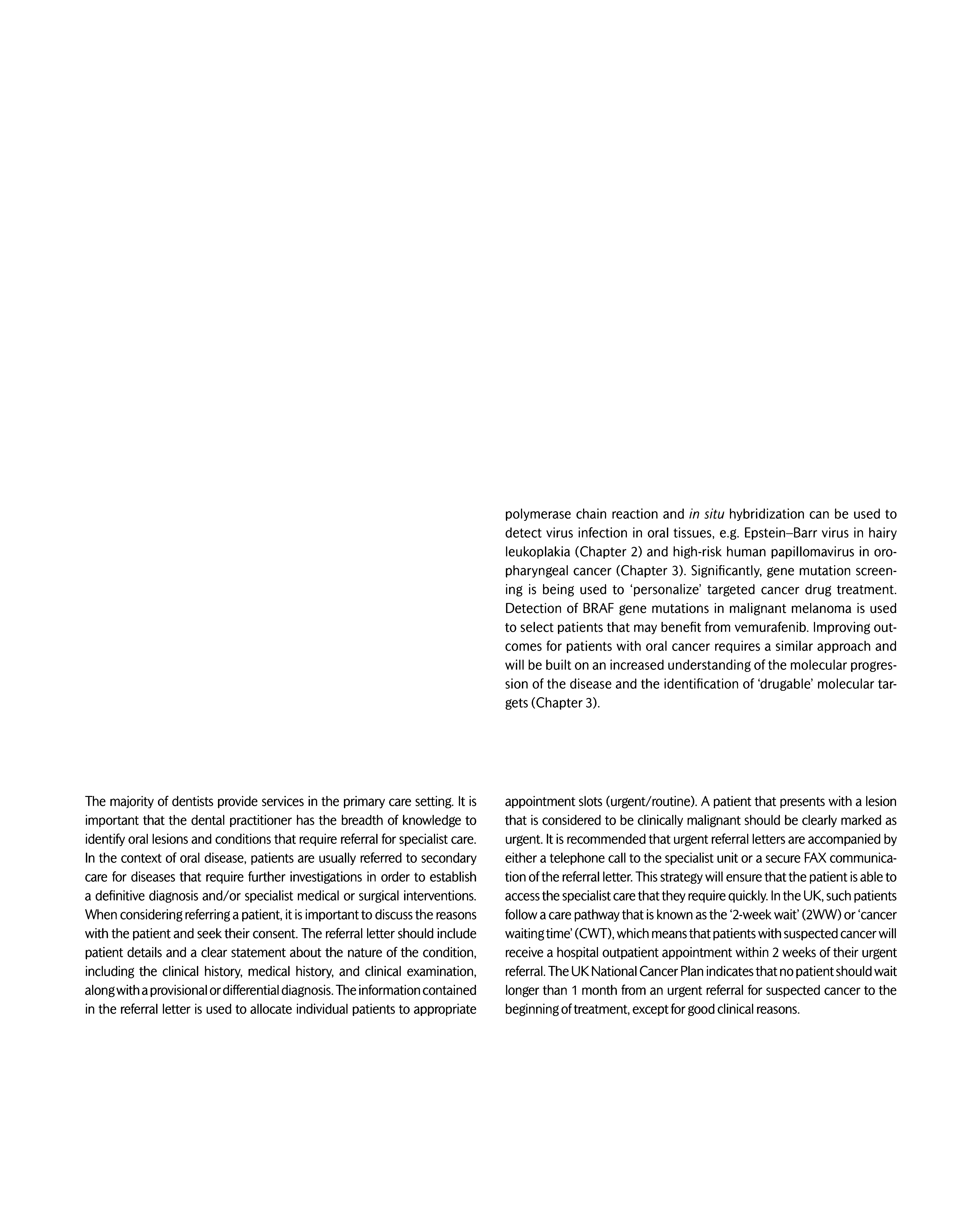 polymerase chain reaction and in situ hybridization can be used to detect virus infection in oral tissues, e.g. Epstein-Barr virus in hairy leukoplakia (Chapter 2) and high-risk human papillomavirus in oropharyngeal cancer (Chapter 3) Significantly, gene mutation screening is being used to ‘personalize’ targeted cancer drug treatment. Detection of BRAF gene mutations in malignant melanoma is used to select patients that may benefit from vemurafenib Improvingoutcomes for patients with oral cancer requires a similar approach and willbebuiltonanincreasedunderstandingofthe molecular progression of the disease and the identification of‘drugable’molecular targets(Chapter3)