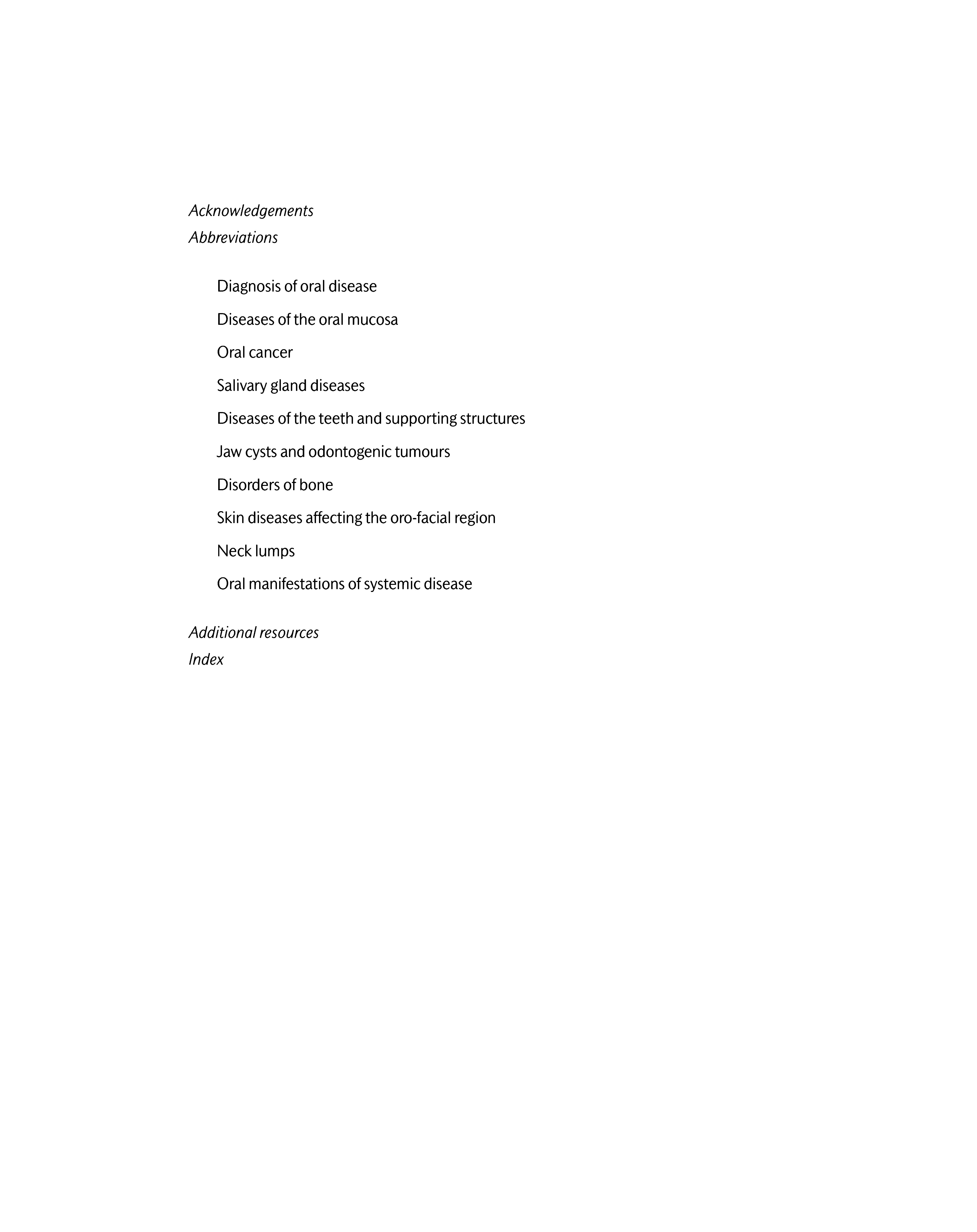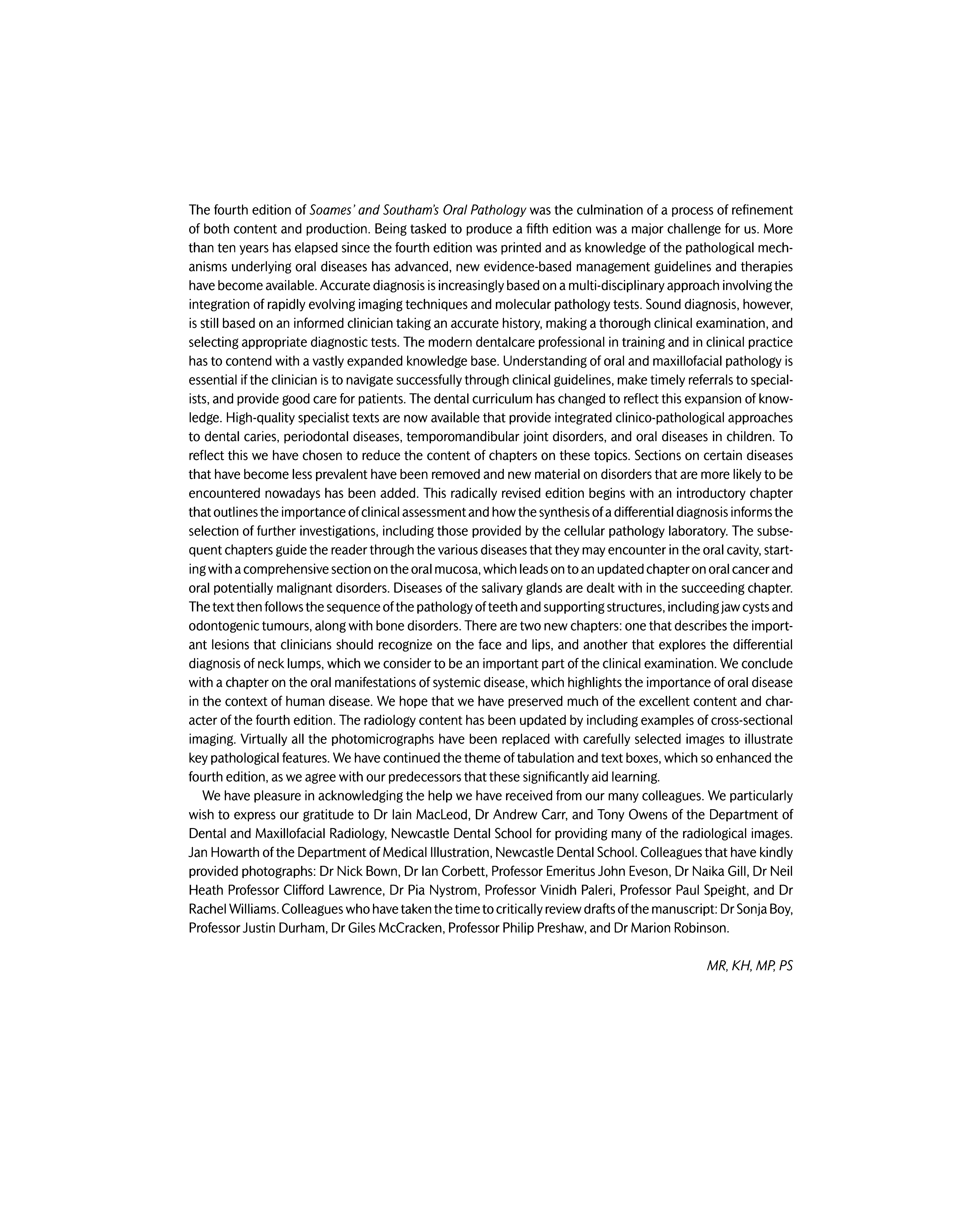 Wehavepleasureinacknowledgingthehelp wehavereceivedfromour manycolleagues Weparticularly wish to express our gratitude to Dr lain MacLeod, Dr Andrew Carr, and Tony Owens of the Department of Dental andMaxillofacial Radiology,Newcastle DentalSchool for providingmany of the radiological images. JanHowarthoftheDepartmentofMedicalIllustration,NewcastleDentalSchool Colleaguesthathavekindly providedphotographs:DrNickBown,Dr IanCorbett,Professor EmeritusJohnEveson,DrNaikaGill,DrNeil Heath Professor Clifford Lawrence, Dr Pia Nystrom, Professor Vinidh Paleri, Professor Paul Speight, and Dr RachelWilliams Colleagueswhohavetakenthetimetocriticallyreviewdraftsofthemanuscript:DrSonjaBoy, ProfessorJustinDurham,DrGilesMcCracken,ProfessorPhilipPreshaw,andDrMarionRobinson
