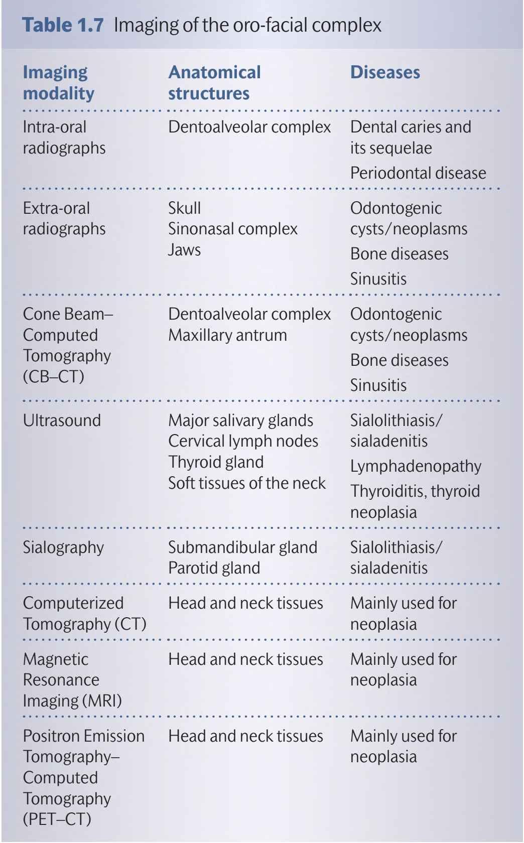 The main imagingtechniques used in the oro-facial complex are listed in Table 1.7 The decision to use imagingas part of the clinical examination is governed by three core principles: justification of the imaging technique,optimizationoftheradiationdose,andlimitingtheamountof