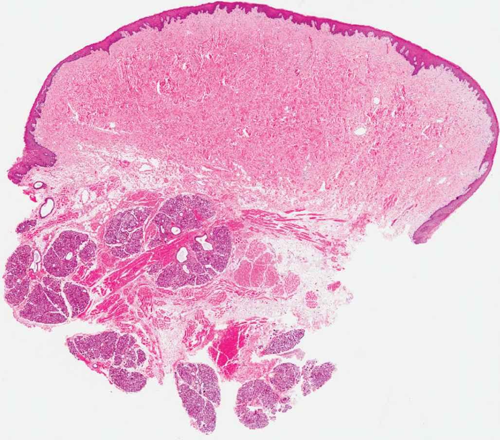 Oral biopsy,left buccal mucosa: a cream piece of muscosa measuring 5 x 3 x 1 mm The mucosa bears a cream polypoid lesion measuring3 x 3 mmtoaheight of3 mm The mucosa isbisected andbothhalvesembeddedin1Afor levels.