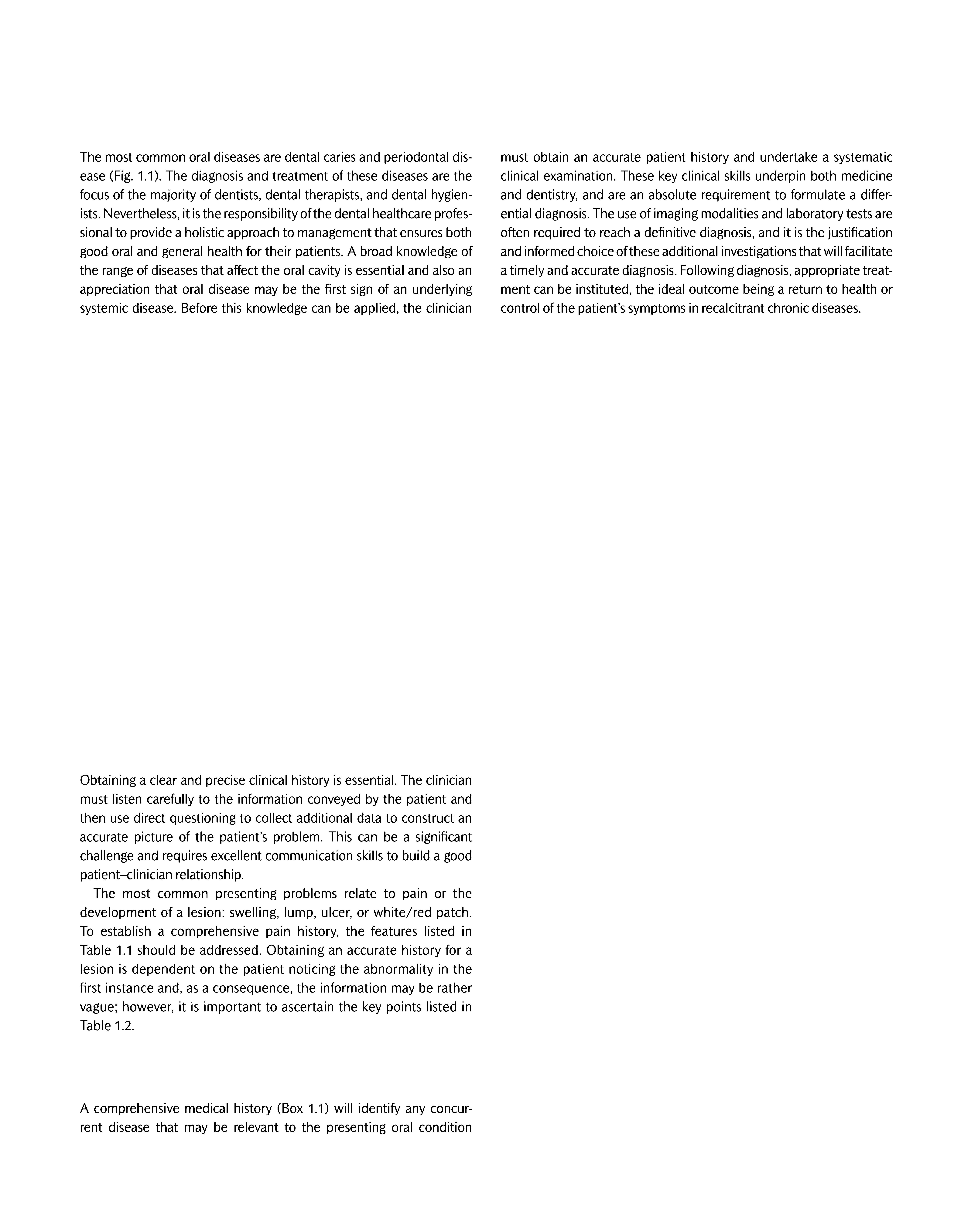 must obtain an accurate patient history and undertake a systematic clinical examination These key clinical skills underpin both medicine and dentistry, and are an absolute requirement to formulate a differentialdiagnosis Theuseofimagingmodalitiesandlaboratorytestsare often requiredtoreacha definitive diagnosis,andit is the justification andinformedchoiceoftheseadditionalinvestigationsthatwillfacilitate atimelyandaccuratediagnosis Followingdiagnosis,appropriatetreatment can be instituted,the ideal outcome beinga return to health or controlofthepatient’ssymptomsinrecalcitrantchronicdiseases
