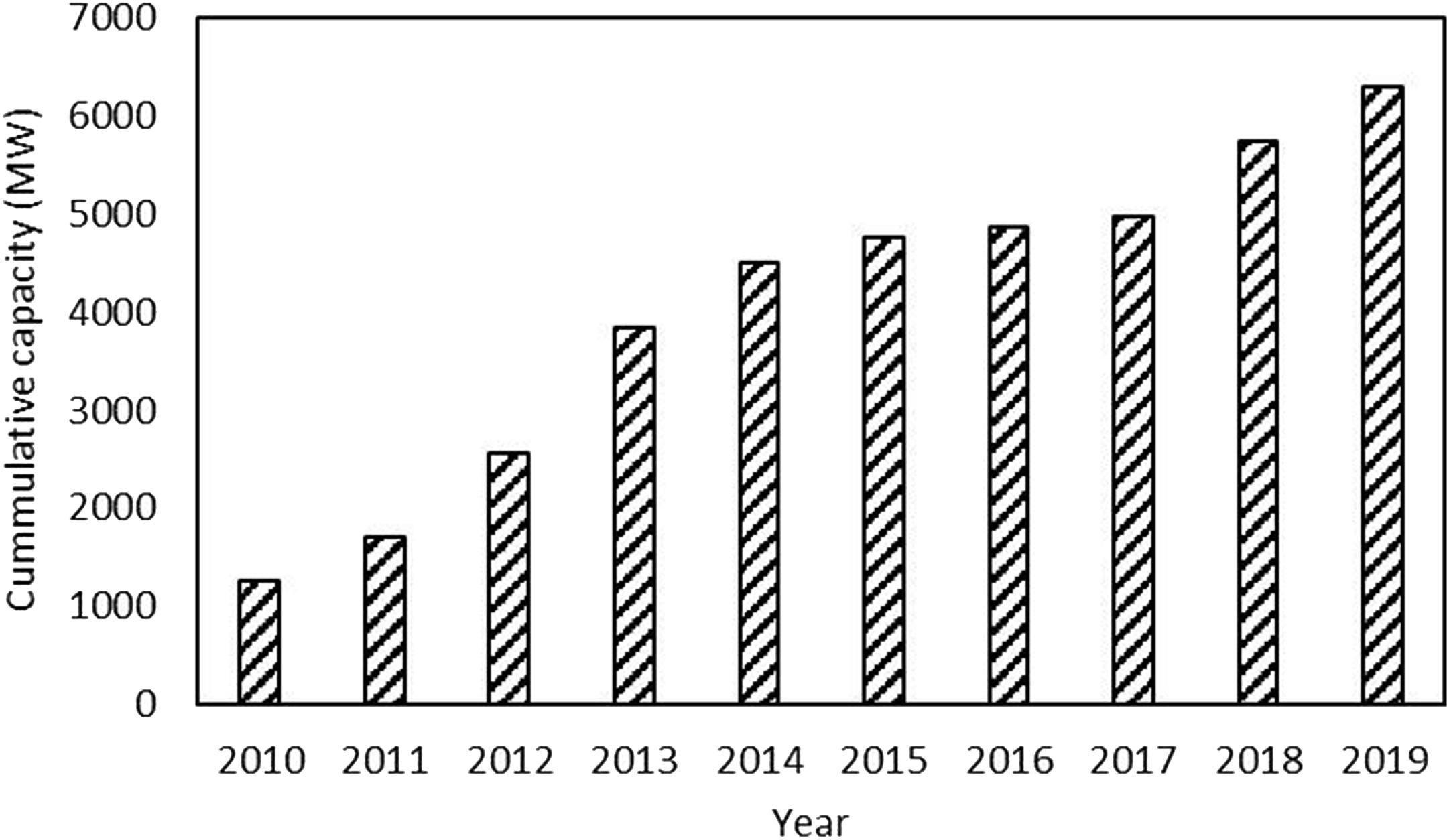 Technology is developed in stages from conceptualization of the idea to commercialization, and the degree of maturity increases with stage number. Technology maturity is a good indicator of the closeness of a technology to commercial application (Selman & Chen, 2012). In this context, CSP is a matured technology, with commercial power plants operating in different parts of the world. The weighted average levelized cost of CSP-based electricity dropped from 0.346 USD/kWh in 2010 to 0.182 USD/kWh in 2019 and predicted to decline further to 0.075 USD/kWh for projects commissioned in 2021 (International Renewable Energy Agency, 2020b). These data show that CSP is currently uncompetitive with coal (0.080 USD/kWh), but it is expected to a ain parity with this fossil fuel in future. Nevertheless, CSP is competitive with other fossil-fuel technologies such as gas turbines and diesel generators at present (Labordena et al., 2017). In this vein, the global cumulative capacity of the CSP technology has been increasing over the past decade, reaching a level of 6289MW in 2019 as shown in Fig. 1.4 that is based on data from (International Renewable Energy Agency, 2020a).