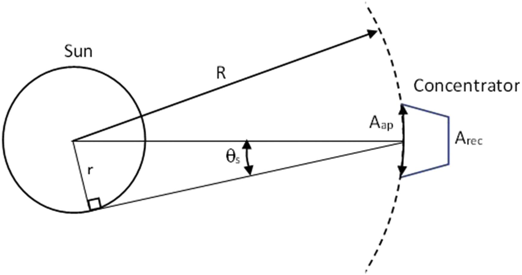 The upper limit of Cr,area depends on the number of dimensions of concentration. A two-dimensional (linear) concentrator such as a parabolic trough focuses radiation on a line, while a threedimensional concentrator such as a parabolic dish focuses radiation on a point. There is an upper limit of the concentration ratio, and this limit is derived from the second law of thermodynamics applied to the radiative heat exchange between the sun and the receiver (Rabl, 1976). Suppose a circular concentrator with aperture area (Aap) focuses radiation from the sun of radius (r) onto a receiver area (Arec) as shown in Fig. 1.5. The concentrator is located at distance R from the sun that subtends an angle 2θs on the concentrator.