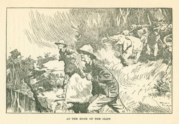 They dropped their rifles and dashed to the right. It was forty or fifty yards to the edge of the cliff; the elephants were already only about half that distance behind them, gaining moment by moment. The ground shook under the tremendous charge of the maddened beasts. To the fleeing men it seemed that the breath from the gaping mouths scorched them.