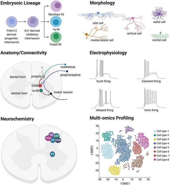 FIGURE1.1 Summaryschematicofthemainclassificationscurrentlyusedtocatalogspinal interneuronalsubpopulationsandexampleswithineachcategorization.Embryoniclineagetracing, dendriticmorphology,anatomyorconnectivity,electrophysiologicalproperties,neurochemistry,or multiomicsprofilinghaveallbeenusedtosubparsespinalinterneuronsintoindividualclasses, highlightingthediversityofinterneuronalpopulations althoughnomethodhasproventobe entirelyeffectiveinisolation.Seemaintextfordetails. 1a-IN:1ainterneuron; CR:calretinin positiveinterneuron; DYN:dynorphinpositiveinterneuron; En1: Engrailed1; EXIN:excitatory interneuron; Foxp2:ForkheadboxproteinP2; GRP:gastrinreleasingpeptidepositiveinterneuron; IN:interneuron; Prdm12:PRdomainzincfingerprotein12; PV:parvalbuminpositiveinterneuron; SOM:somatostatinpositiveinterneuron. Imagecreatedwith BioRender.com.