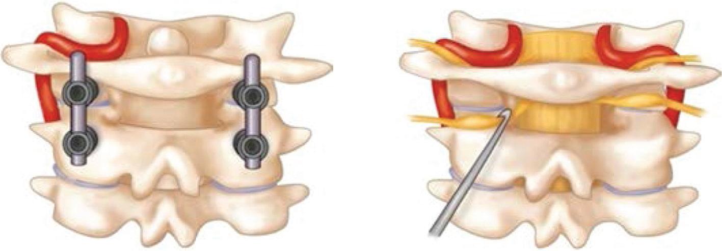 Neurovascular injuries are the most concerning intraoperative complications. With a posterior approach, one of the feared complications is injury to the vertebral artery with screw malposition. An anomalous vertebral artery further increases the risk of injury, especially with C1–C2 transarticular or C2 pedicle screw placement. Preoperative imaging should be closely evaluated for aberrant vessels. Careful intraoperative technique, avoiding C2 pedicle screws with aberrant vertebral artery anatomy, and directing the C1 lateral mass screw superomedially is essential to avoid vertebral artery damage.13 Damage to a single vertebral artery may be asymptomatic with intact contralateral supply, but bilateral injury can be catastrophic. With an anterior approach, careful retraction and dissection should be used to avoid injury to the internal carotid and esophagus. Other potential rare complications