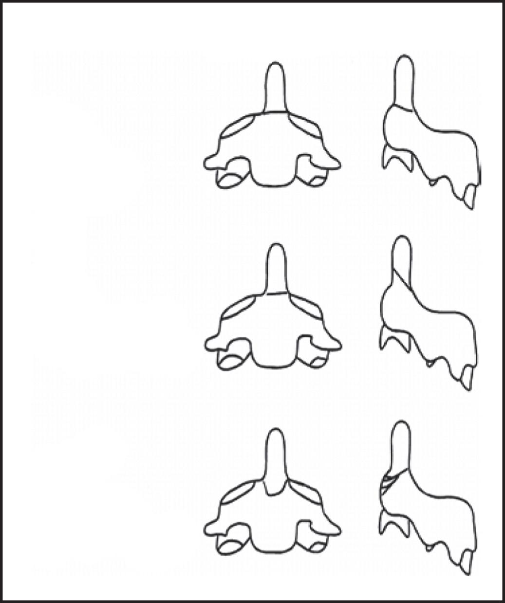 Odontoid fractures can be classified into three types as described by Anderson and D’Alonzo (Figure 1.1).3 Type I odontoid fractures represent an avulsion fracture of the tip of the odontoid through the alar ligament. Type II is the most common C2 fracture pattern and is defined by a fracture line at the base of the odontoid. Type II fractures have the greatest risk of nonunion due to the disruption of the tenuous blood supply.Type III fractures occur through the vertebral body and extend into the superior articular facets. Greater vascularity in the C2 body results in a low nonunion rate with cervical orthosis for this fracture type. Grauer and colleagues proposed subclassifying type II fractures to guide treatment decisions (Figure 1.2).Type IIA are transverse fractures, type IIB are angled anterosuperior to posteroinferior, and type IIC are either angled from anteroinferior to posterosuperior or are comminuted fractures.23 This fracture classification is useful when considering an odontoid screw as patients with a IIC are not appropriate for odontoid screw fixation.