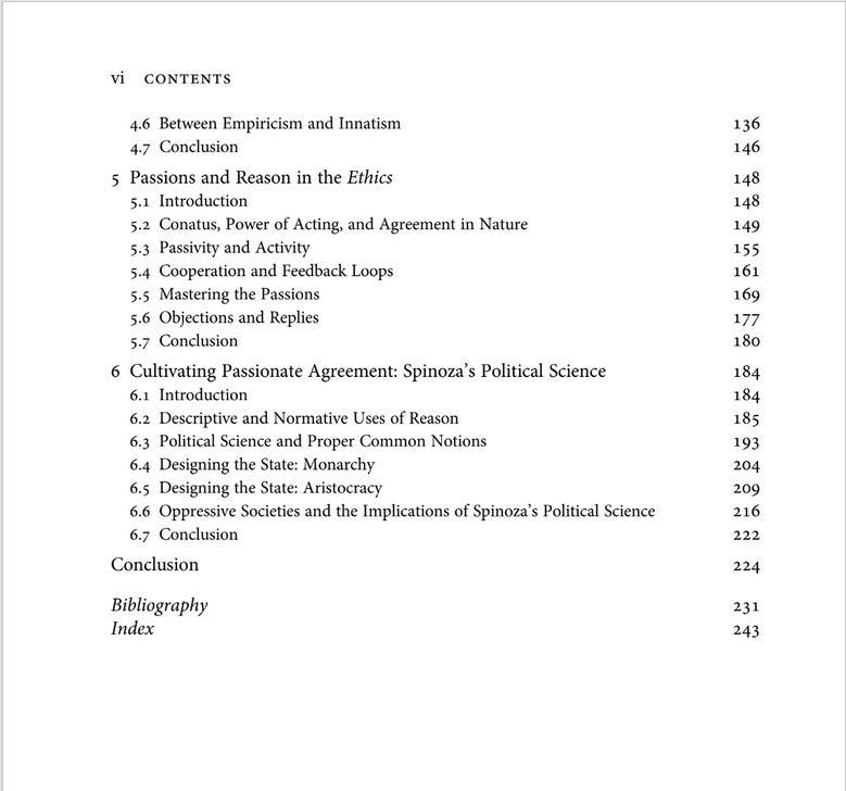 ThesixchaptersofthisbookchronologicallytrackSpinoza’sdevelopingthoughton therelationshipbetweenreason,passions,andtheSupremeGood.