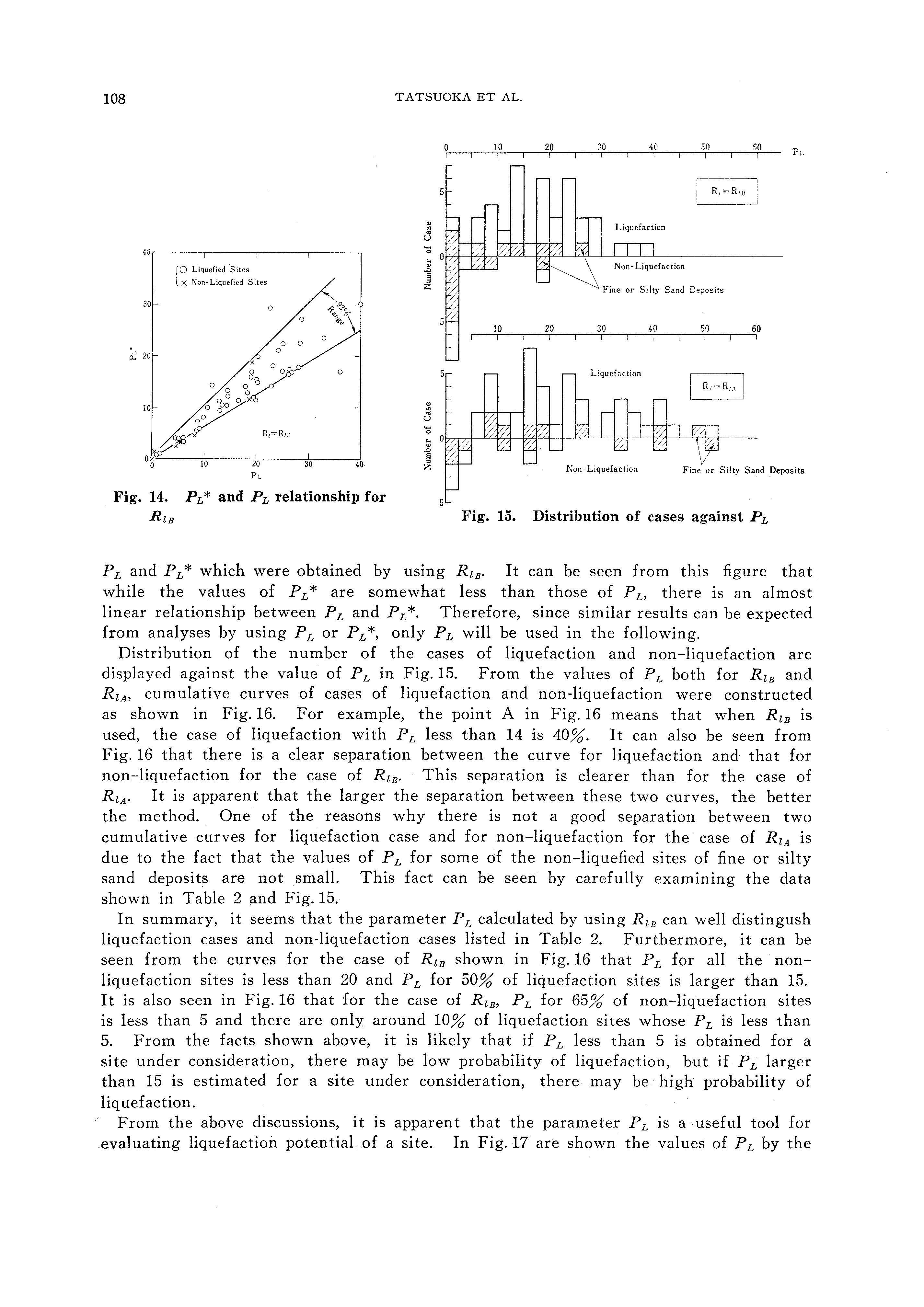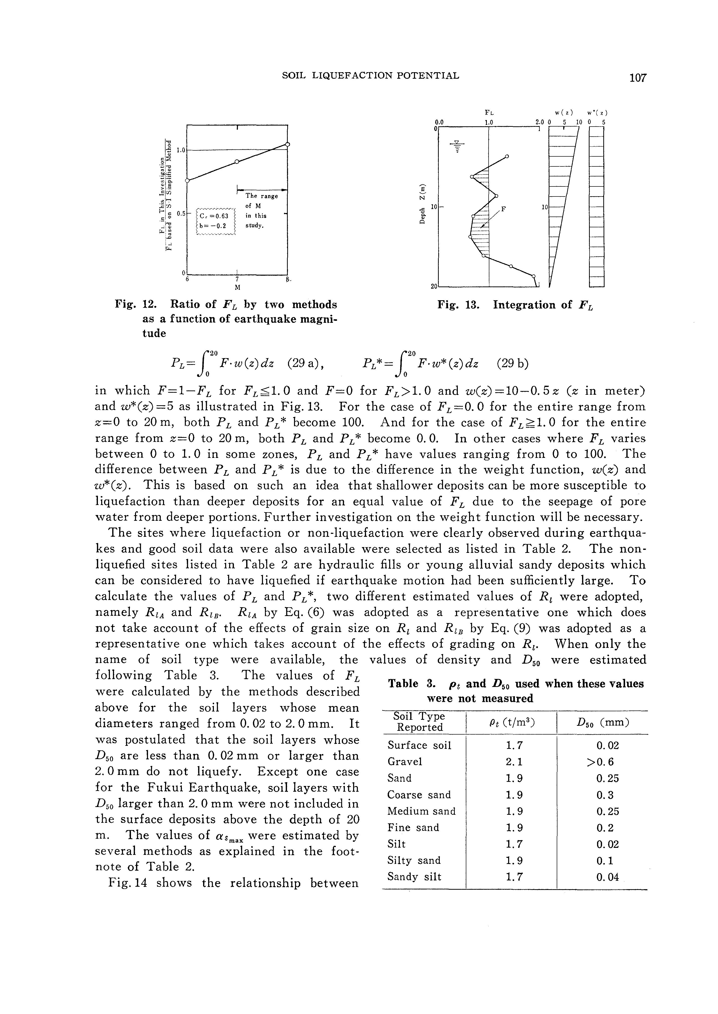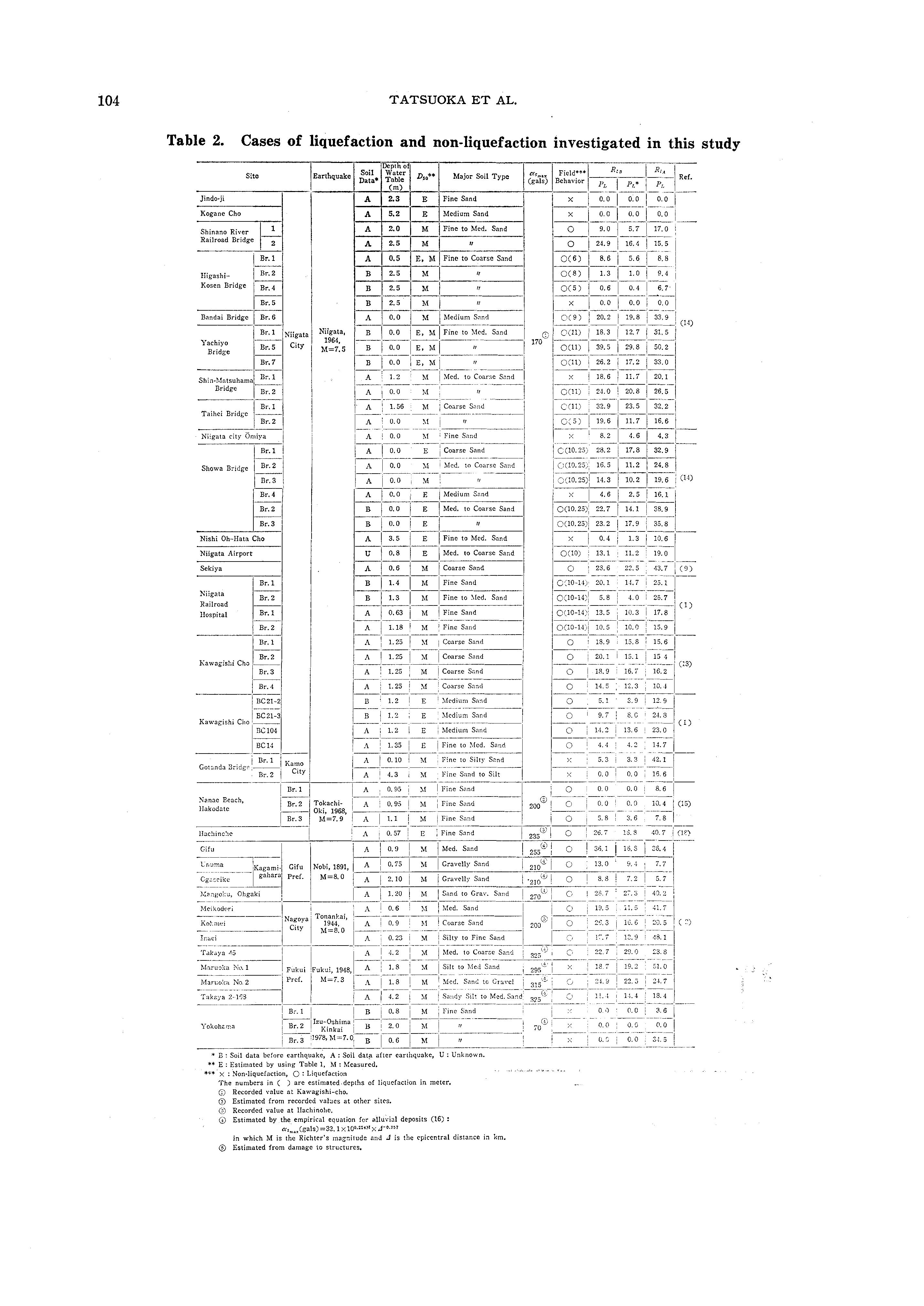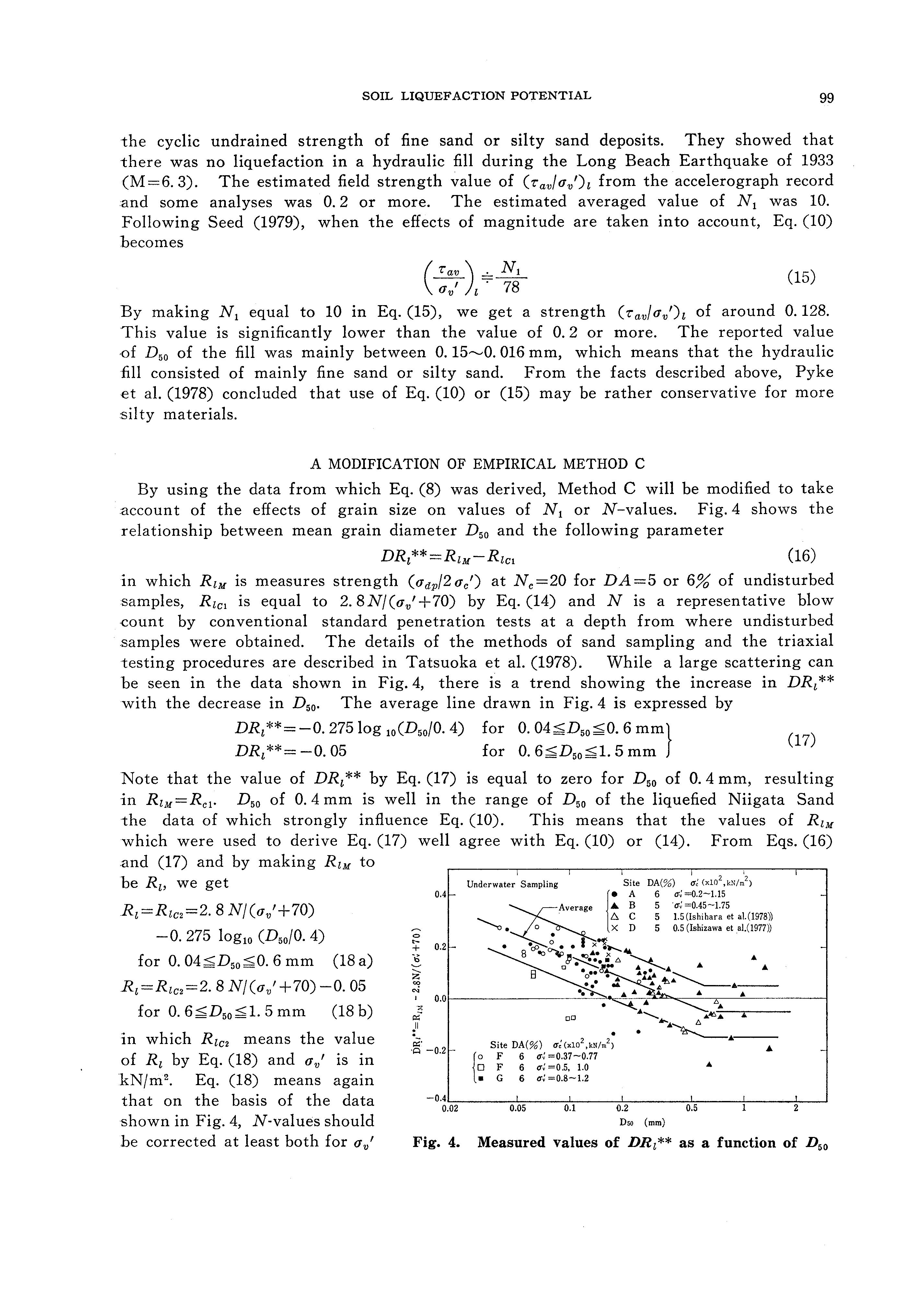 m which Rici means the value of Ri by Eq. (14). It should be noted that Eq. (10) is strongly influenced by the data from the Niigata Earthquake of 1964. It was shown by the recent investigation by Ishihara et al. (1978) and other data that for the conditions at Niigata, the mean grain size for the liquefied soil ranged mainly from about 0. 2 mm to 0. 7 mm. This means that Eq. (10) is most applicable to clean medium sand deposits. Pyke et al. (1978) has reported that Eq. (10) or Eq. (14) could significantly underestimate