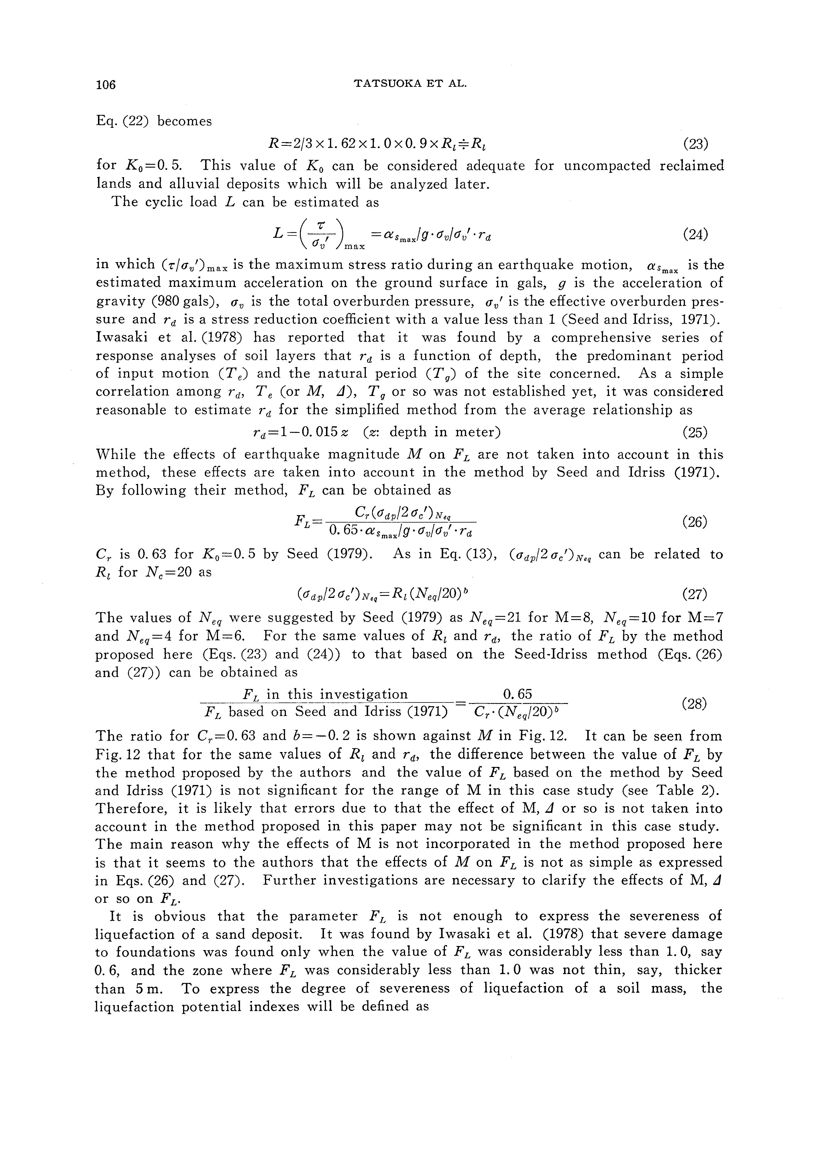 in which Cr is a correction factor. By the data shown by Seed (1979), Cr is 0. 63 for K 0 =0. 5, which is the reasonable value for normally consolidated young alluvial deposits and uncompacted hydraulic fills. By Seed (1979) Neq is equal to around 15 for M=7-1/2. Tatsuoka et al. (1980) showed that Ri = (adp/2 a/)Nc= 20 can be approximately related to (adp/2 ac')Nc=l5 as (13)