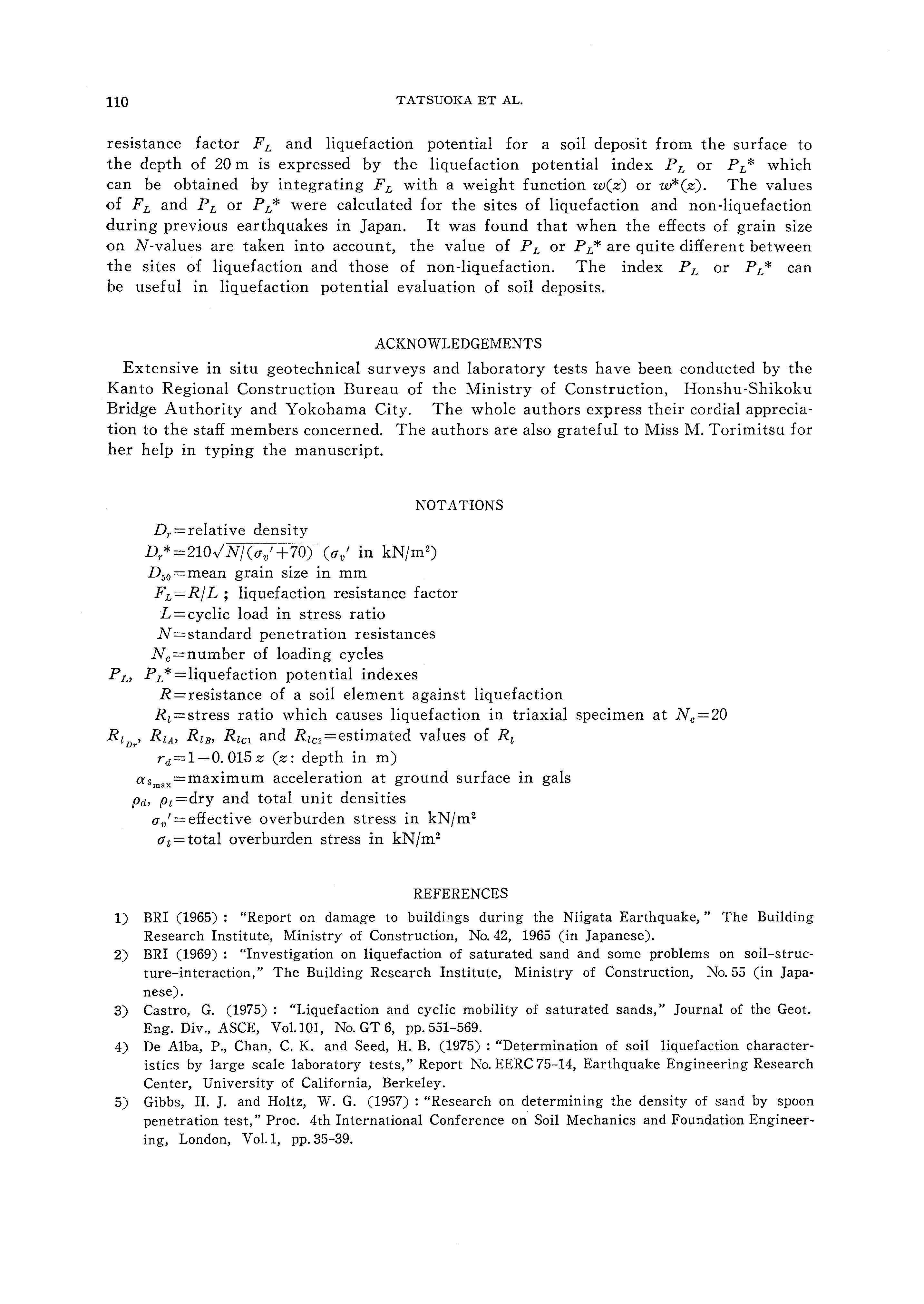 values into Eq. (20), we get (T'av/a,/)i of around 0. 274, which is much larger than 0.128 estimated by Eq. (15) and is well comparable with the value of 0. 2 or more which was the strength estimated from the recorded acceleration. It should be emphasized here that Eq. (18) is a result of one trial to improve Eq. (14) for taking account of the effects of grading or grain size on N-values. Eq. (18) should be improved in future based on our improved knowledges.