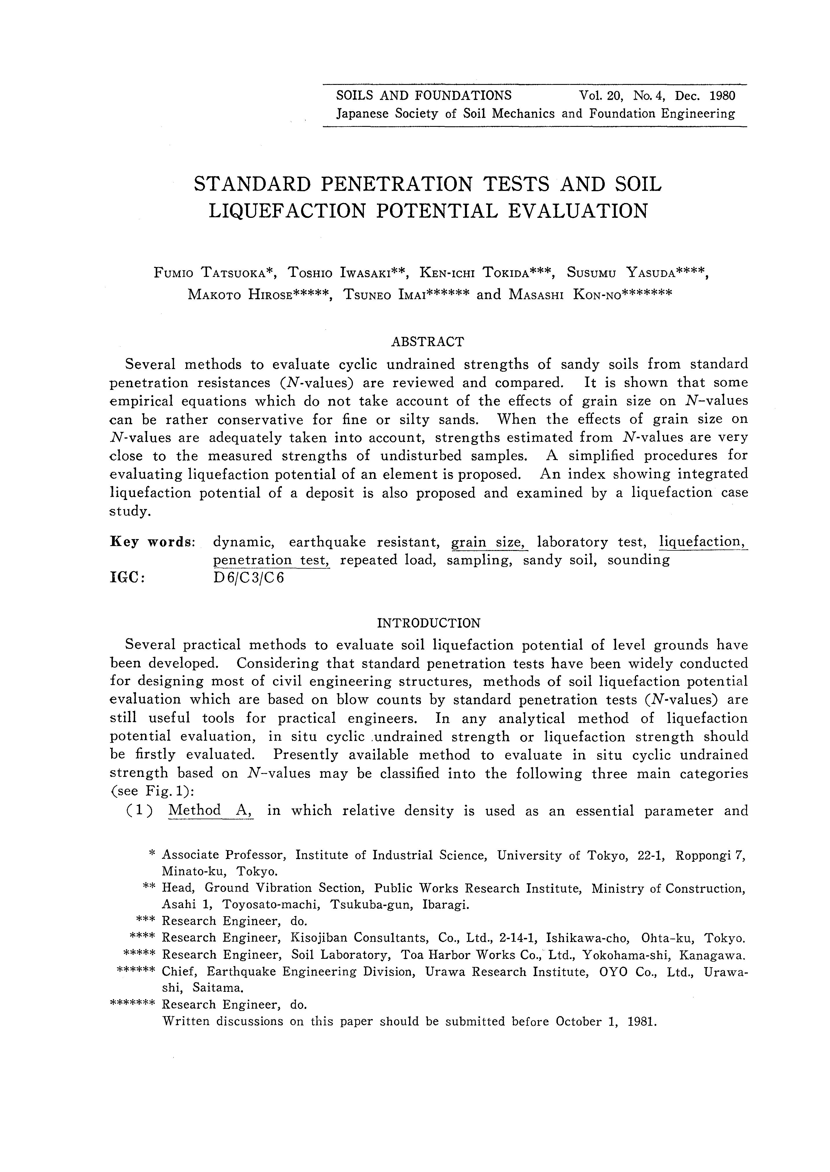Key words: dynamic, earthquake resistant, grain size, laboratory test, liquefaction, penetration test, repeated load, sampling, sandy soil, sounding JGC: D6/C3/C6