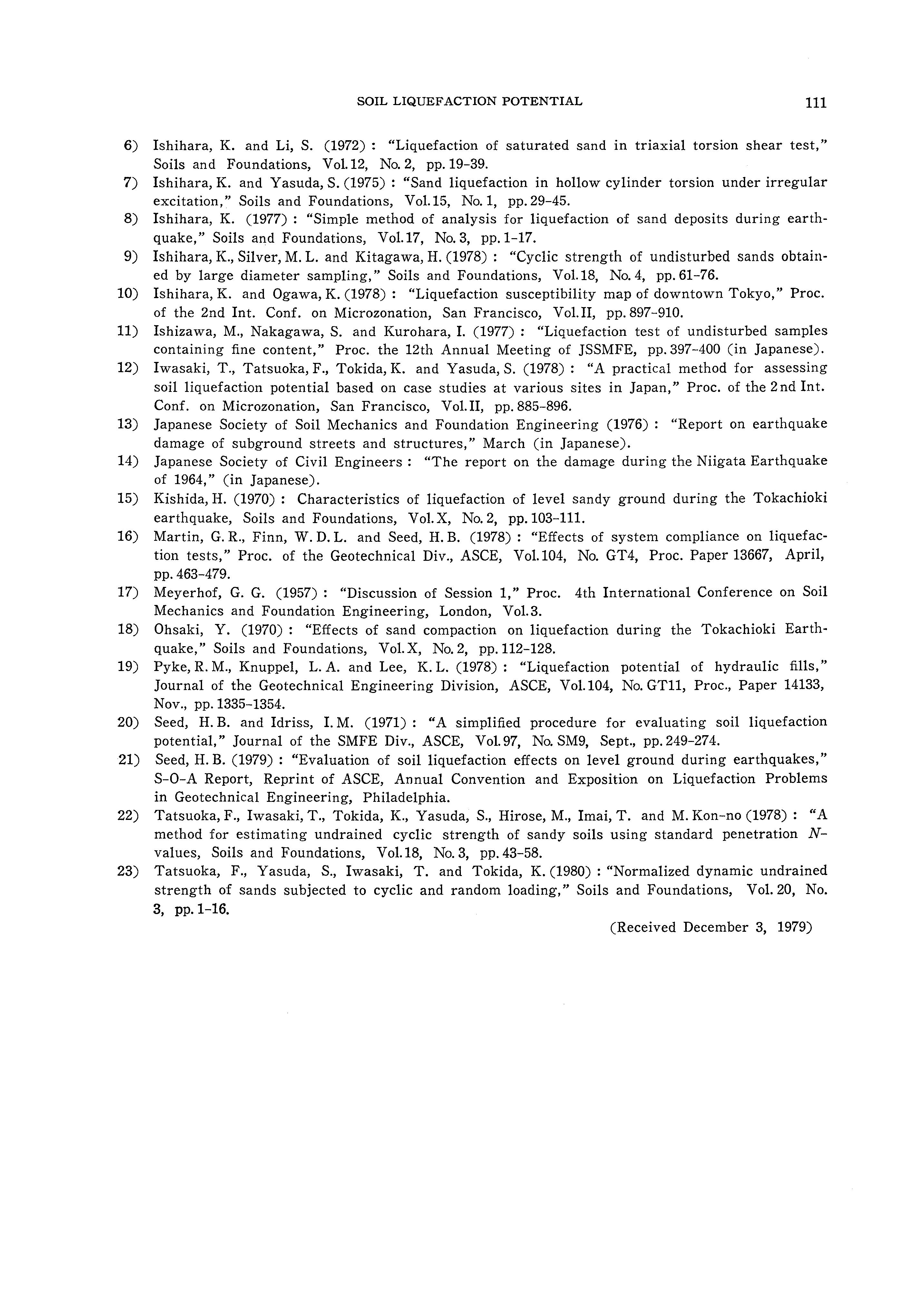 8) Ishihara, K. (1977) : "Simple method of analysis for liquefaction of sand deposits during earthquake," Soils and Foundations, Vol.17, No. 3, pp.1-17.