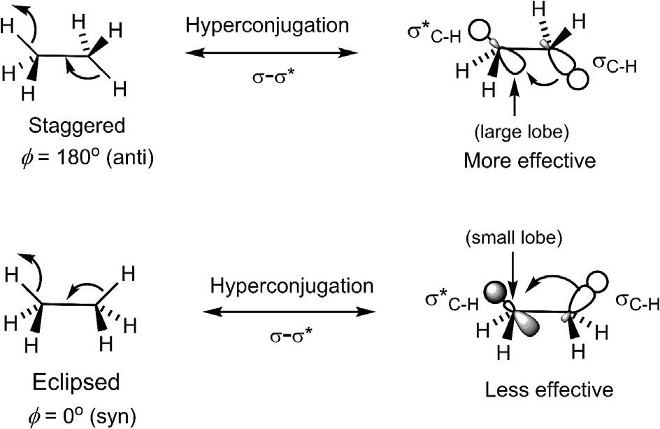 Calculations13 indicatethatifthehyperconjugationeffectsareswitchedoff, eclipsedconformationispreferred.Thushyperconjugation,notthefilled/filled repulsion,istheoriginofthetorsionalbarrierinethane.11,13 Itshouldbenoted thattherearethreeantiH/Hpairsinstaggeredethanesothateach σ–σ* hyperconjugationstabilizesitroughlyby1kcalmol 1.Inotherwords,eachH/H eclipsingraisestheenergyby 1kcalmol 1 .
