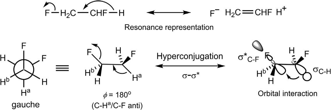 Thereasonforthepreferenceofthegaucheformisattributedtotherelatively smallvanderWaalsrepulsionbetweentwofluorineatoms(vanderWaals radius ¼ 1.5–1.6A ˚ )andastrongstereoelectroniceffectby σC H–σ* C F hyperconjugation24 (Fig.1.11).Thestereoelectronicrequirementforaneffective hyperconjugationistheantiperiplanarityoftheinvolvedC HandC Fbonds (ϕ ¼ 180degrees).Intheanticonformer,noC Fbondisantiperiplanartoa C Hbond.Incontrast,bothC Fbondsinthegaucheconformercanbenefitfromthefavourable σC H–σ* C F overlap(infrontierorbitalterms,