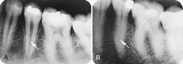 Figure 1.10 Pulp cavity size. (A) Premolar radiograph of young person. (B) Premolar radiograph of older person. Note the difference in the size of the pulp cavity (arrows)