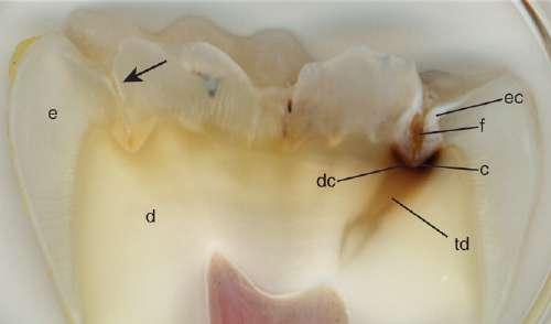 Figure 1.9 Fissure (f) at junction of lobes allows accumulation of food and bacteria predisposing the tooth to dental caries (c); enamel (e); dentin (d); enamel caries lesion (ec); dentin caries lesion (dc); transparent dentin (td); early enamel demineralization (arrow).