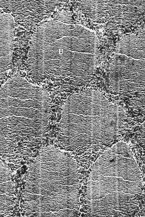 Figure 1.3 Electron micrograph of cross-section of rods in mature human enamel. Crystal orientation is different in ‘bodies’ (B) than in ‘tails’ (T). Approximate level of magnification 5000× (From Meckel AH, Griebstein WJ, Neal RJ: Structure of mature human dental enamel as observed by electron microscopy, Arch Oral Biol 10(5):775–783, 1965.)