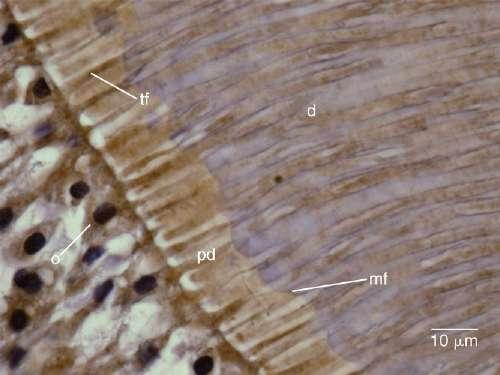 Figure 1.12 Odontoblasts (o) have cell processes (Tomes’ fibres [tf]) that extend through the predentin (pd) into dentin (d). mf, Mineralization front.
