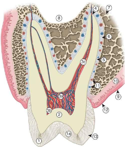 Figure 1.2 Cross-section of the maxillary molar and its supporting structures. 1, Enamel; 1a, gnarled enamel; 2, dentin; 3a, pulp chamber; 3b, pulp horn; 3c, pulp canal; 4, apical foramen; 5, cementum; 6, periodontal fibres in periodontal ligament; 7, alveolar bone; 8, maxillary sinus; 9, mucosa; 10, submucosa; 11, blood vessels; 12, gingival and 13, striae of Retzius.
