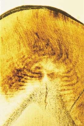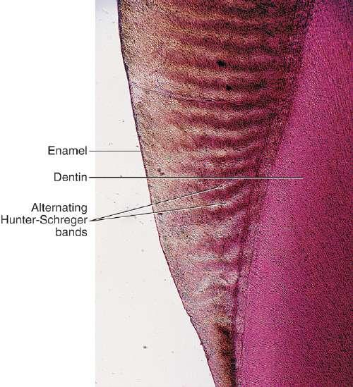 The changes in the direction of enamel prisms that minimize fracture in the axial direction produce an optical appearance called Hunter–Schreger bands (Fig. 1.6). These bands appear to be composed of alternate light and dark zones of varying widths that have slightly different permeability and organic content. These bands are found in different areas of each class of teeth. Because the enamel rod orientation varies in each tooth, Hunter–Schreger bands also have a variation in the number present in each tooth. In anterior teeth, they are located near the incisal surfaces. In molars, the bands occur from near the cervical region to the cusp tips.