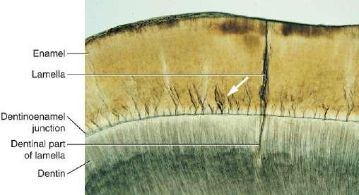 Enamel lamellae are thin, leaf-like faults between enamel rod groups that extend from the enamel surface to the DEJ, sometimes extending into dentin (Fig. 1.7). They contain mostly organic material, which is a weak area predisposing a tooth to the entry of bacteria and dental caries.
